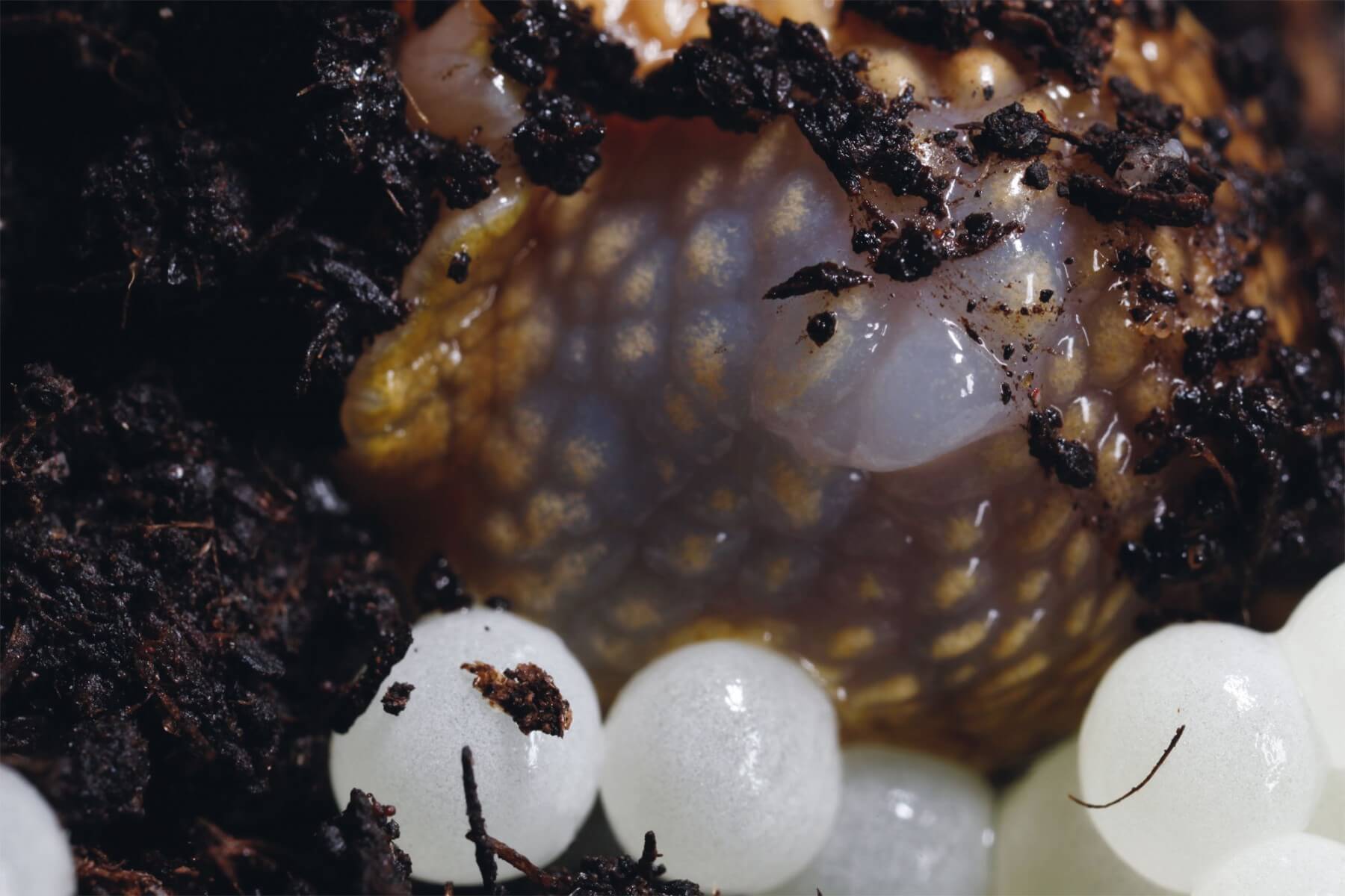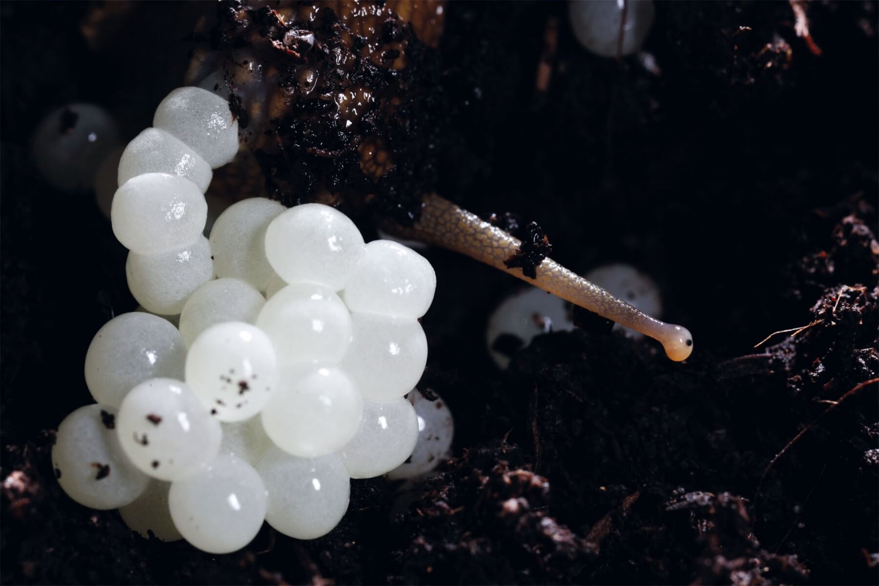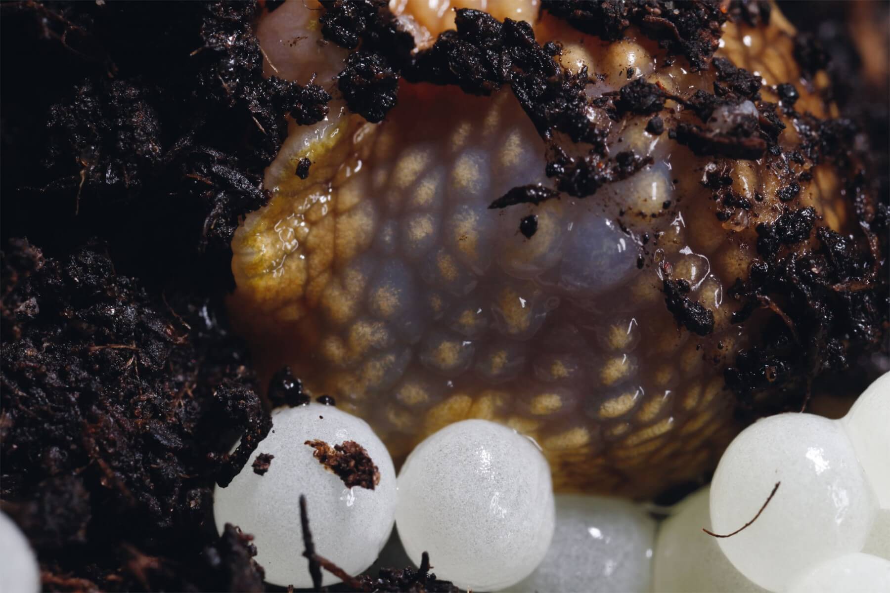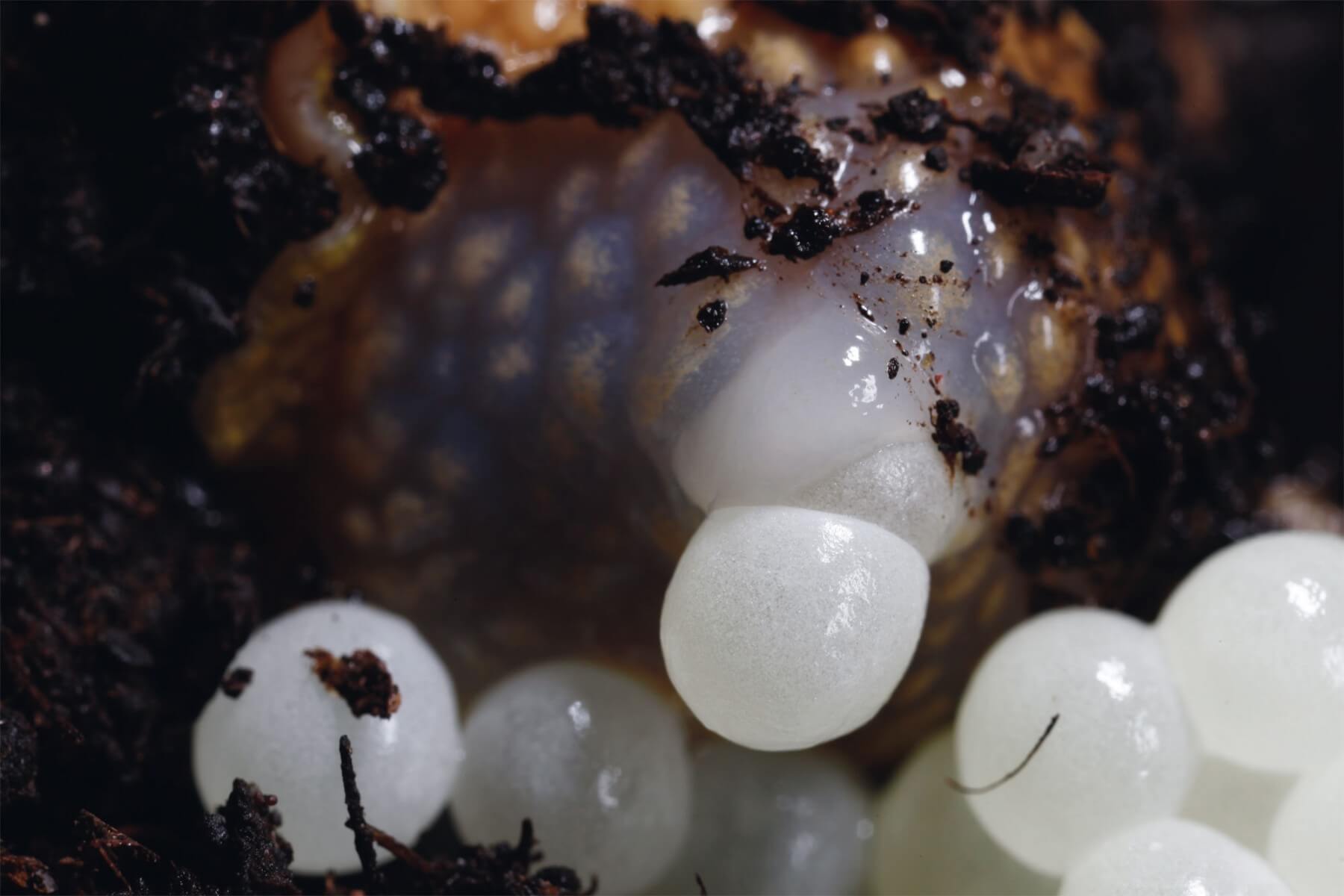 Après une pause bienvenue, le mollusque commence à expulser ses œufs les uns après les autres. Tous les quarts d'heure, toutes les demi-heures parfois, il libère sur le côté de sa tête une perle blanche de la taille d'un petit pois. Et cela peut durer ainsi une dizaine d'heures. Au fil du temps, la ponte s'égrène en chapelet au fond du nid. Puis la bête épuisée fait une nouvelle longue sieste avant de remonter lentement en bouchant son tunnel. Bravo, mission accomplie !
