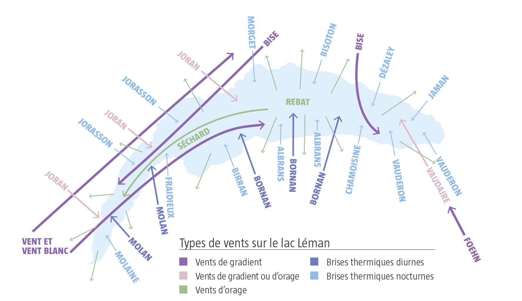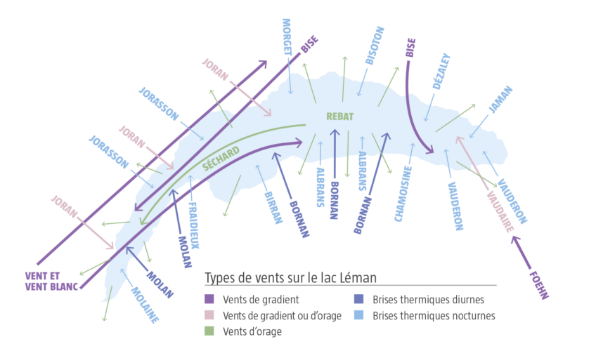 Patois du Léman : Depuis la nuit des temps, les populations de chaque région nomment les vents qui amènent le mauvais ou le beau temps, ou d’autres présages de la nature. On voit ici sur les bords du lac Léman, partagés entre la France et la Suisse, qu’une multitude d’appellations existent pour qualifier des courants d’air locaux.