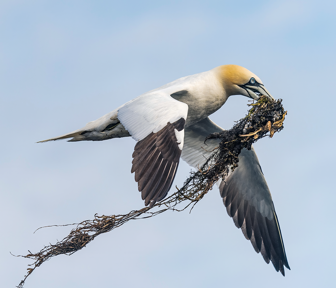 La densité des fous de Bassan est incroyable avec presque deux nids par mètre carré. Quand ils sont posés au sein de la colonie, ils ont un comportement social. Mâles et femelles se câlinent. Pour consolider leur nid, ces majestueux oiseaux de 1,80 m d’envergure vont prélever des algues qui flottent en mer.