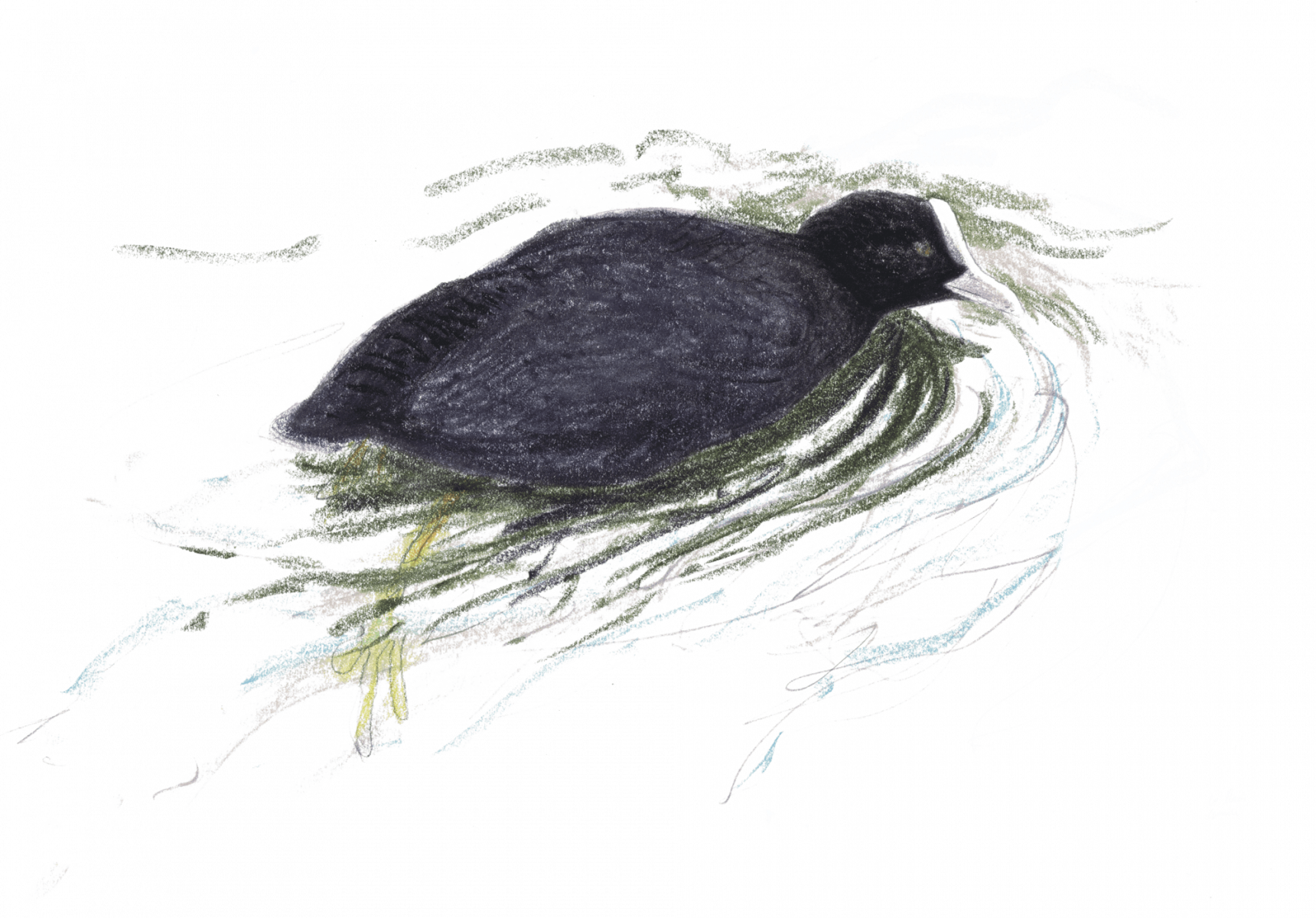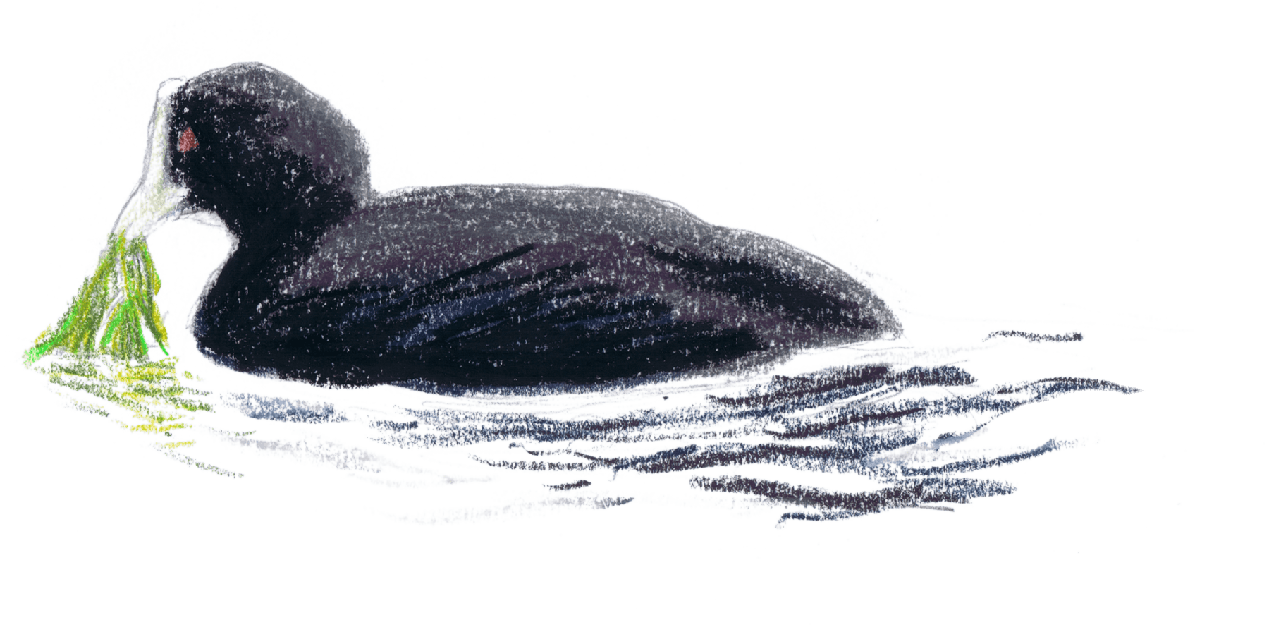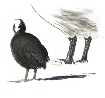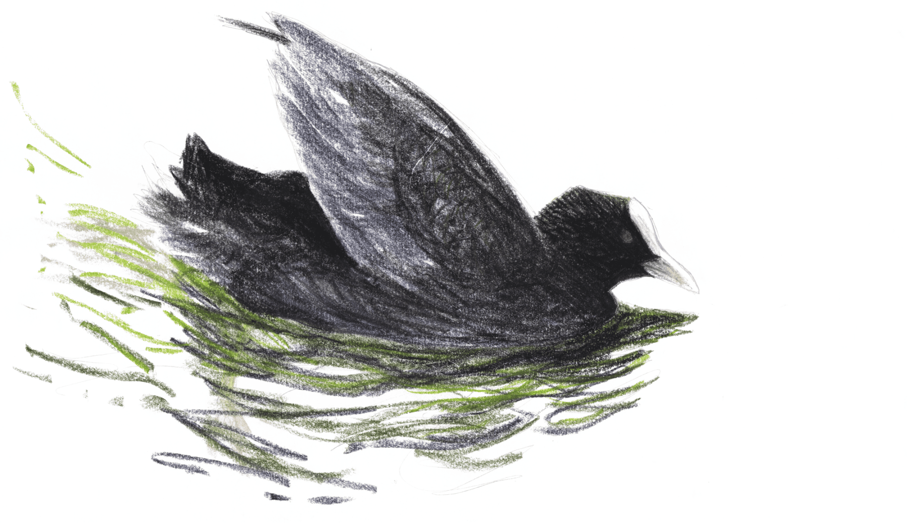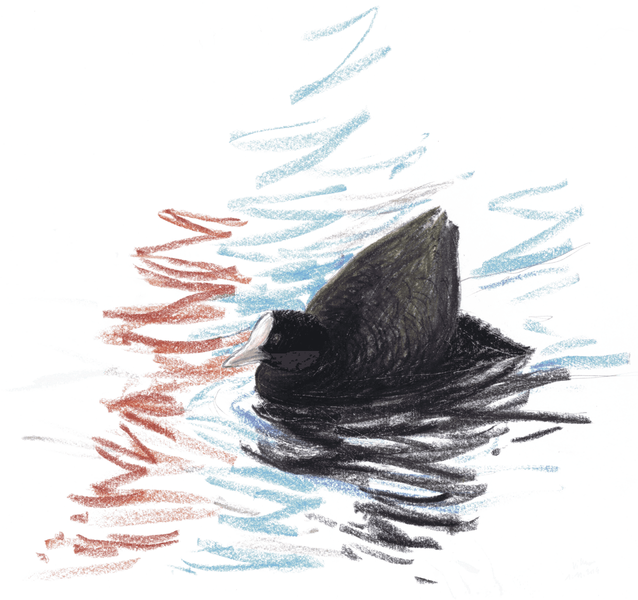 Un individu téméraire quitte le groupe et nage vers le môle de manière décidée. Près de la rive, la foulque de débarquement s’élève sur des pattes ridiculement grandes et semi-palmées. Va-t-elle oser s’aventurer sur la terre ferme ? Métamorphose ! Hors de l’eau, l’oiseau noir exhibe une rondeur surprenante et marche de manière presque élégante, comme s’il ne voulait pas se salir les doigts.