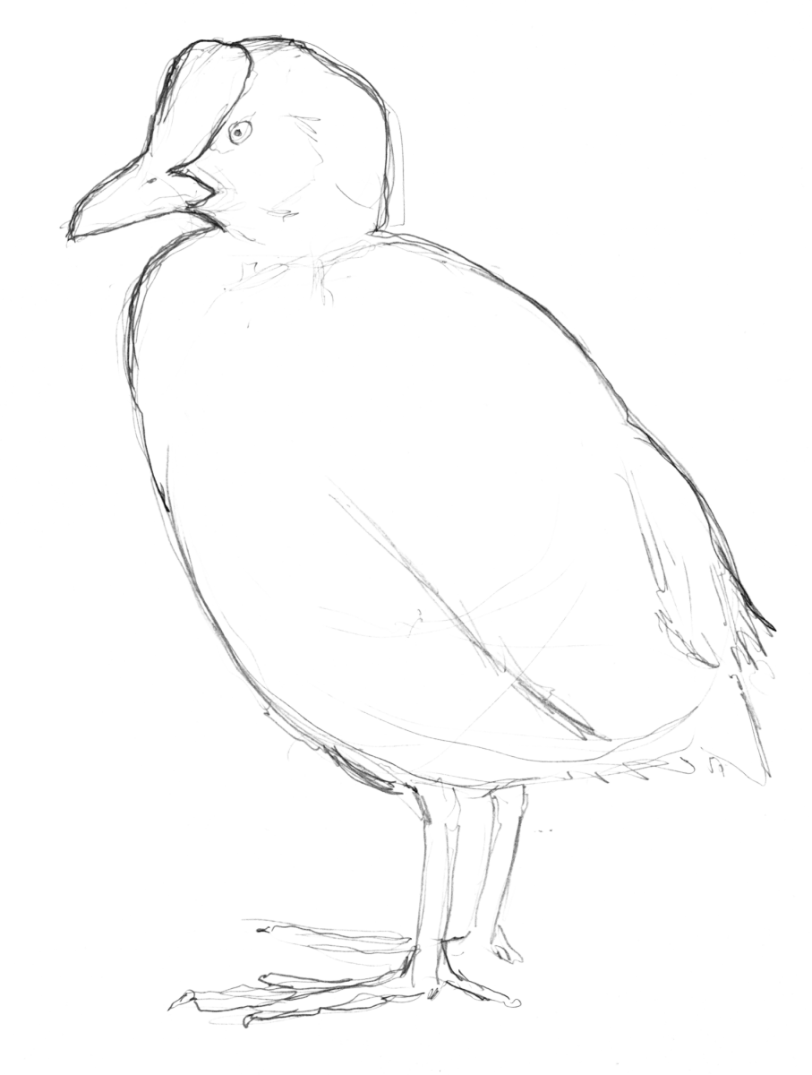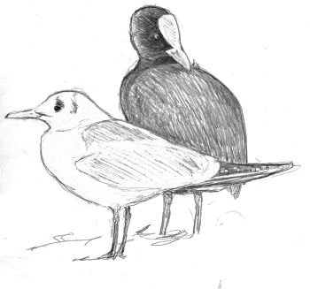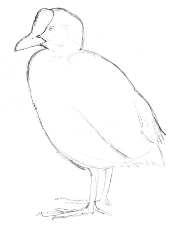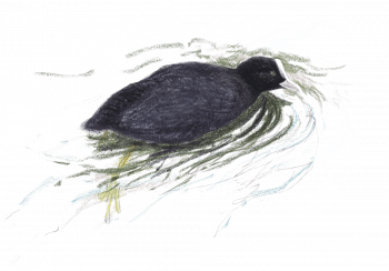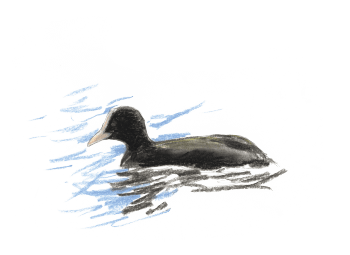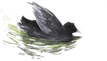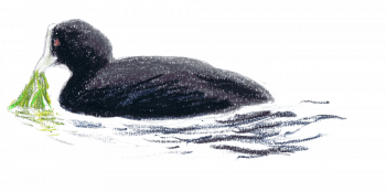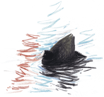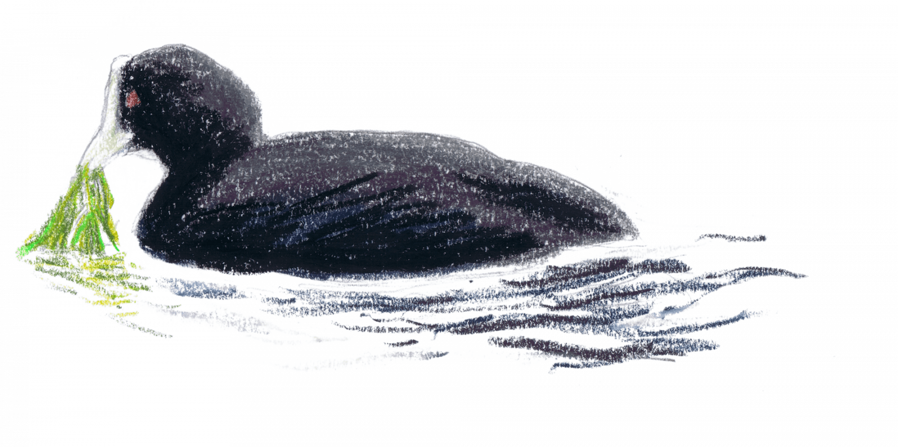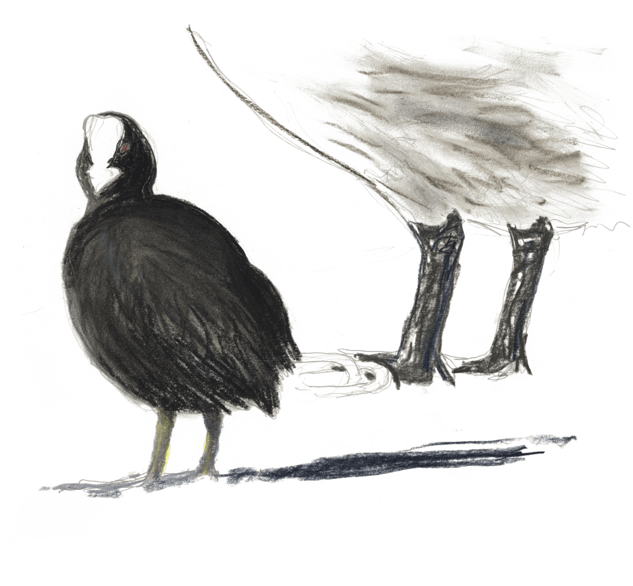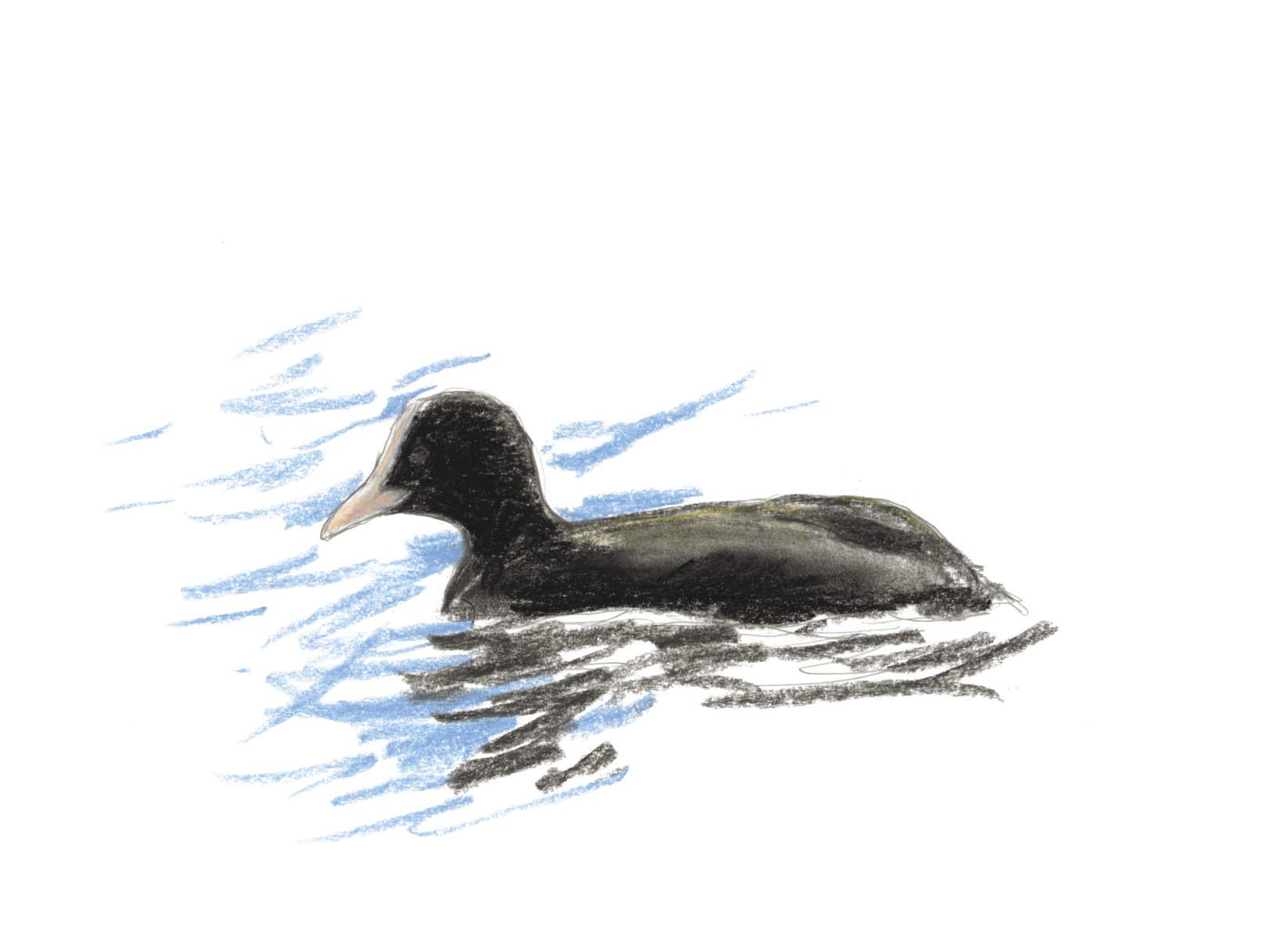Un individu téméraire quitte le groupe et nage vers le môle de manière décidée. Près de la rive, la foulque de débarquement s’élève sur des pattes ridiculement grandes et semi-palmées. Va-t-elle oser s’aventurer sur la terre ferme ? Métamorphose ! Hors de l’eau, l’oiseau noir exhibe une rondeur surprenante et marche de manière presque élégante, comme s’il ne voulait pas se salir les doigts.