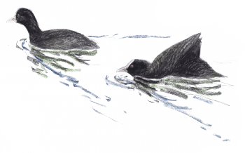 Après plusieurs controverses lacustres, la flottille de macroules s’accorde une trêve. Une à une, les frégates se transforment en sous-marins. Un bref saut sur place pour prendre de l’élan et… plouf ! Elles plongent à la verticale. Dix secondes plus tard, les voilà qui remontent à la surface comme des gros bouchons avec un bout de zostère ou de characée dans le bec. Elles avalent les algues en secouant la tête avant de s’immerger à nouveau pour une nouvelle pêche.