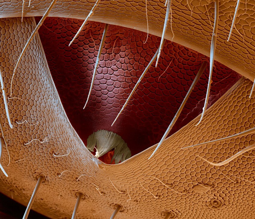 La fourmi est construite à l'inverse des mammifères. Son squelette est à l'extérieur. Appelée cuticule, cette armure articulée protège ses muscles et ses organes. De même, au contraire de notre moelle épinière qui court dans le dos, la chaîne nerveuse des insectes est ventrale. Et tous les organes digestifs sont placés dans le dos !