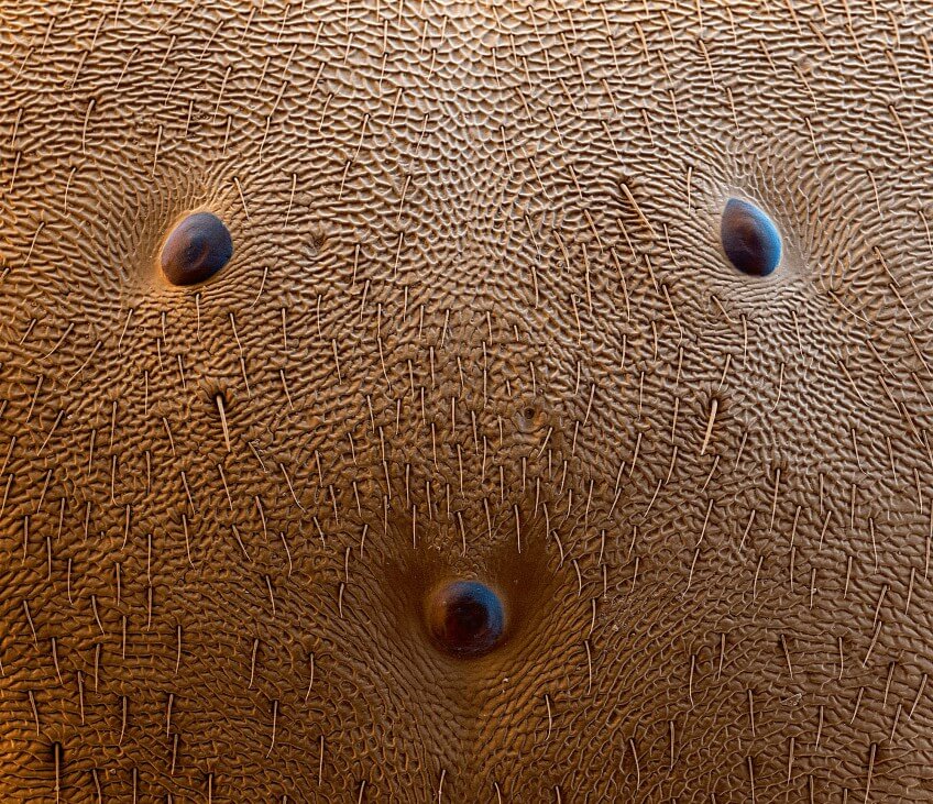Sur le sommet de la tête, la fourmi possède trois petits yeux supplémentaires appelés ocelles. Ils sont situés entre les deux yeux composés et sont uniquement destinés à renseigner l'insecte sur l'intensité lumineuse.