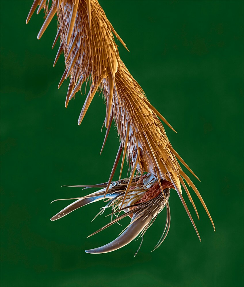 Comment fait-elle pour marcher sur les murs et au plafond ? Deux griffes et un coussinet permettent à la fourmi de s'accrocher à la moindre aspérité. Une surface qui nous paraît lisse devient un mur d'escalade bourré de prises.