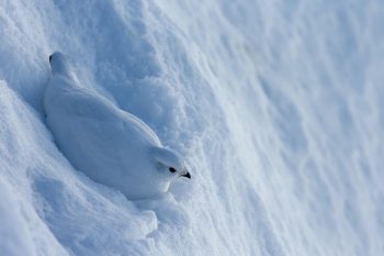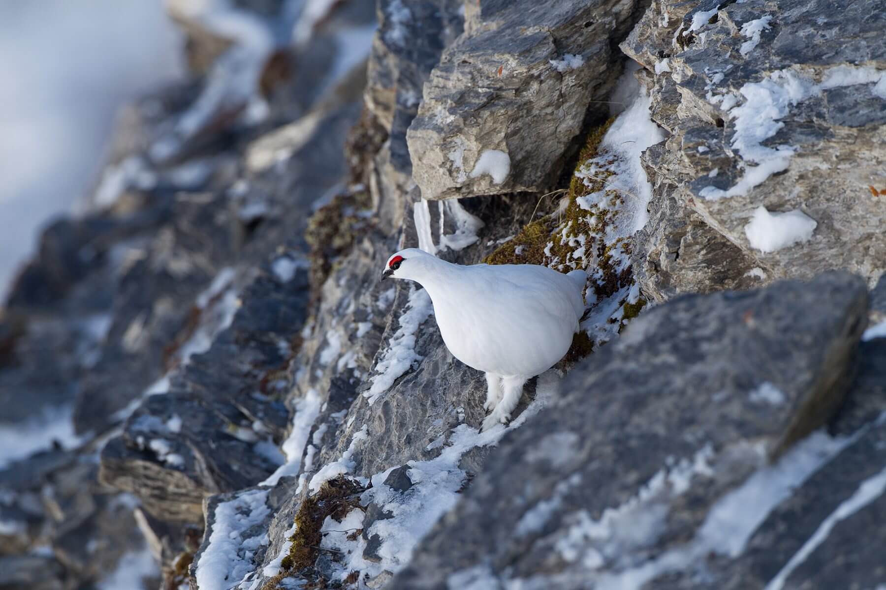 Le lagopède, lui, peut être approché sans affût et toute l’année. Il est mimétique, c’est-à-dire que son plumage se fond dans le paysage. Il fait donc confiance à son camouflage. Une fois repéré, l’approche doit bien sûr être très lente, il faut prendre son temps. Je le suis discrètement jusqu’à trouver une belle lumière. J’aime travailler au même niveau que l’animal, couché à même le sol. Parfois l’appareil est à moitié enfoncé dans la neige.