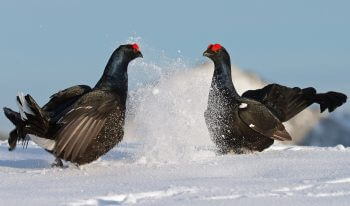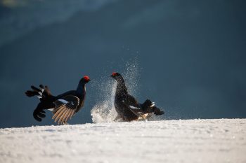 Quant à la qualité des photos, je ne fais aucun compromis. La lumière en particulier doit être très bonne. Cette exigence vient certainement de ma formation de photographe professionnel à Vevey. Pour prendre le bon cliché, il faut retourner beaucoup de fois au même endroit, parfois pour y rester peu de temps. Le tétras lyre ne chante qu’une heure maximum après le lever du soleil. Cela laisse très peu de temps pour réaliser une belle photo après une nuit d’attente. Le secret c’est de persévérer. C’est très physique. Mais j’aime qu’il y ait un défi, de la difficulté. Plus on part en affût, plus on devient exigeant. On essaie de saisir d’autres comportements dans des contextes différents. J’ai par exemple pris un combat de tétras lyre dans la poudreuse, ce qui donne une ambiance tout en mouvement et en légèreté.