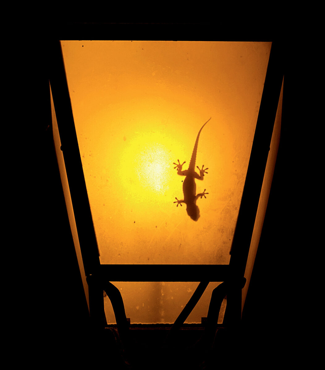 Dans le halo d’un lampadaire, un gecko se tient immobile sur la façade, comme à l’affût. Quelle étrange bestiole se cache derrière ces gros yeux ?