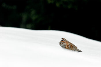 Les oiseaux qui vivent cachés trahissent généralement leur présence par un bavardage puissant ou une voix qui porte loin. C’est le cas du minuscule troglodyte, de l’énigmatique rossignol ou encore de la nocturne hulotte. Rien de tel chez la gélinotte qui, en plus de la sobriété de son plumage et de la timidité de ses mœurs, pratique un ramage des plus ténus. Pour défendre son territoire ou attirer madame, le coq gélinotte lance un sifflement pur et fin, aussi aigu que ceux des roitelets, rougegorges et autres merles. Autant dire que pour détecter ces subtils appels au milieu de la chorale printanière, mieux vaut avoir l’ouïe fine.