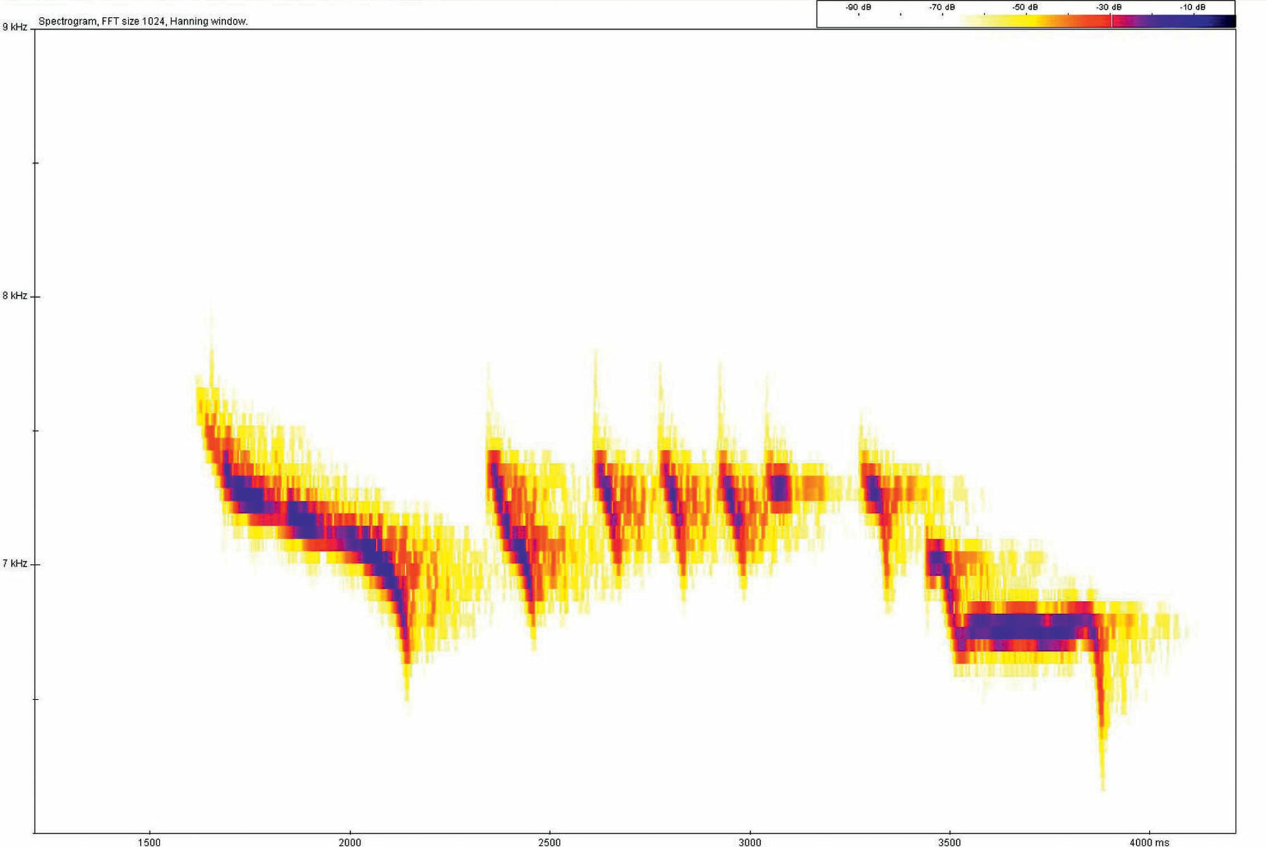 Sonagramme du chant de la gélinotte des bois « Alisier ». La phrase type de l’espèce est constituée de quatre motifs généralement transcrits comme « Tsi si sisisi sisisisi ». La femelle chante parfois, mais dans une fréquence moins aiguë et avec une plus grande variabilité individuelle.