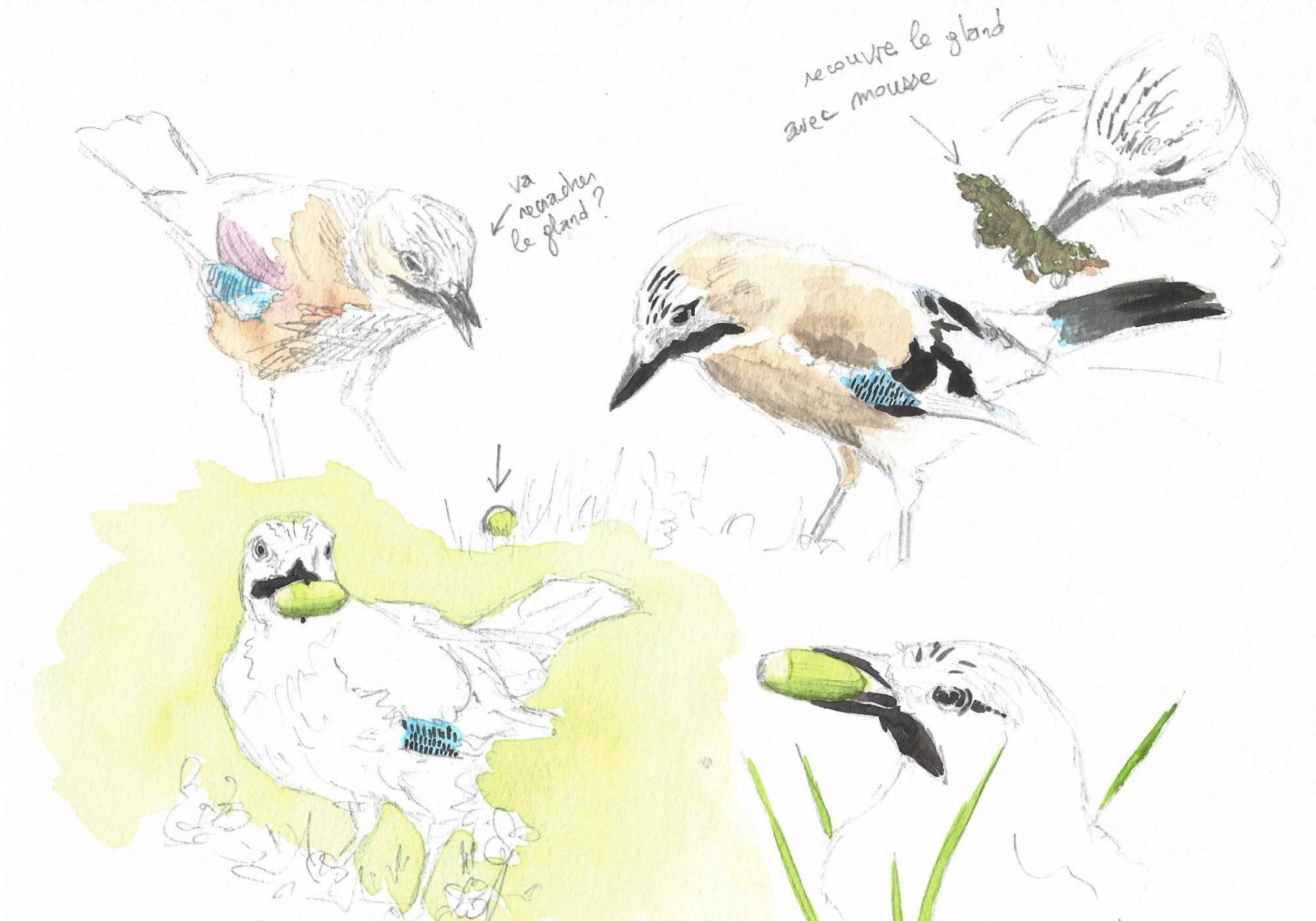Je commence à comprendre lorsqu'il se trouve au pied d'un arbuste d'ornement dont j'ai oublié le nom. Il régurgite alors un gros gland vert pomme. Il le saisit du bout du bec et l'enfonce dans le sol. Après quelques minutes, il collecte des feuilles mortes, des brindilles et de la mousse qu'il dépose sur son trésor.
