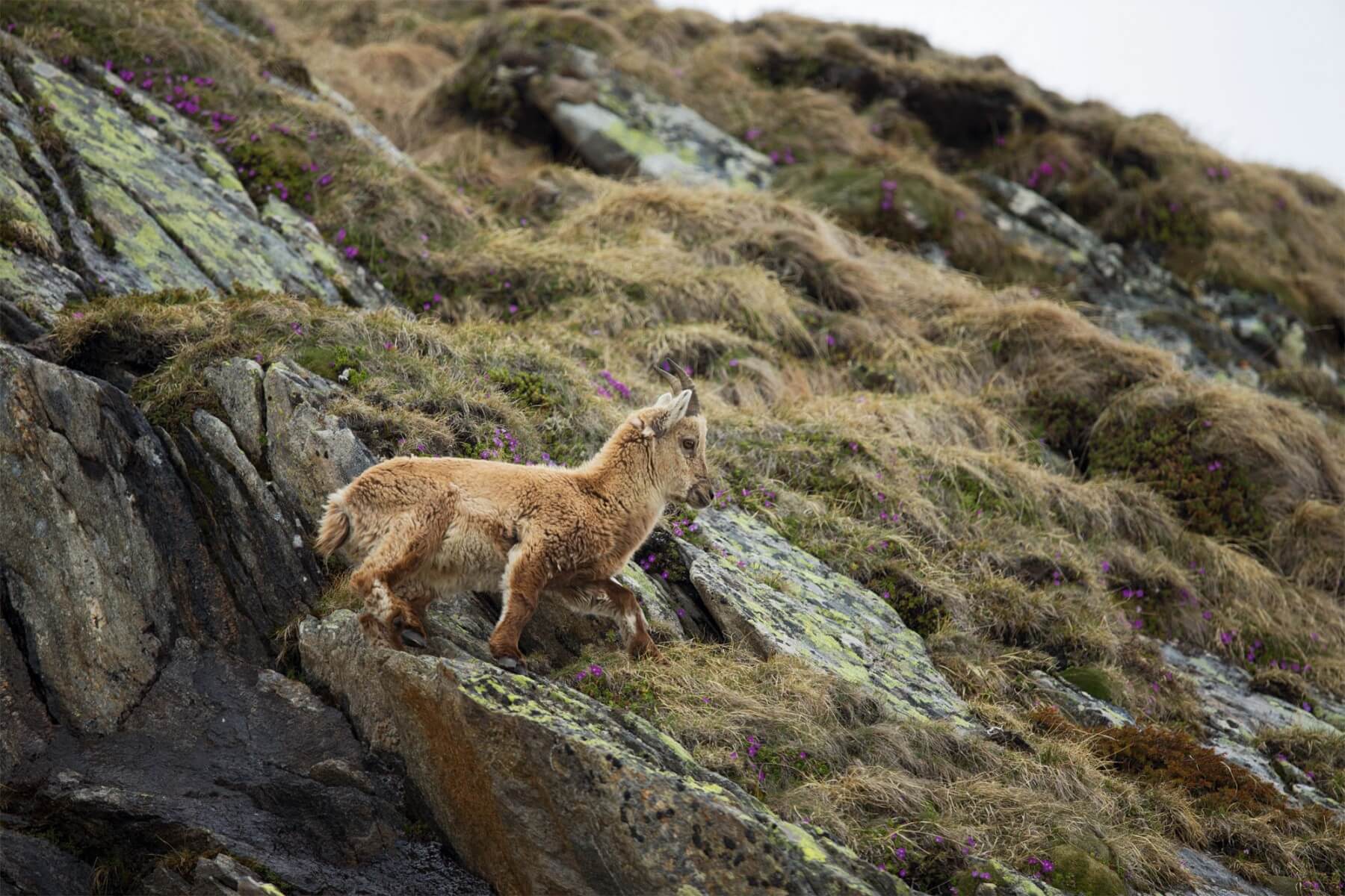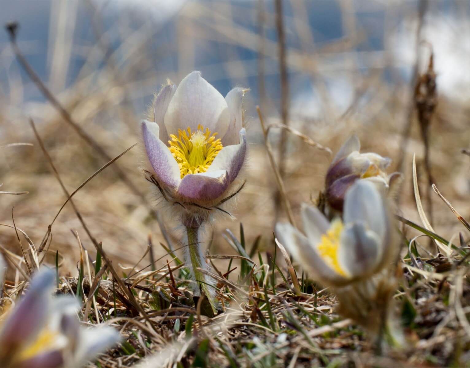 J'avance avec ma sœur sous une fine pluie, un sac photo de 20 kg sur les épaules. Par terre, partout des pulsatilles de printemps et dans les gouilles des pontes de grenouille rousse. Une couche de neige de 40 cm recouvre encore la moitié de la pente tapissée de myrtilles, de rhododendrons, de saules buissonnants et d'aulnes verts.