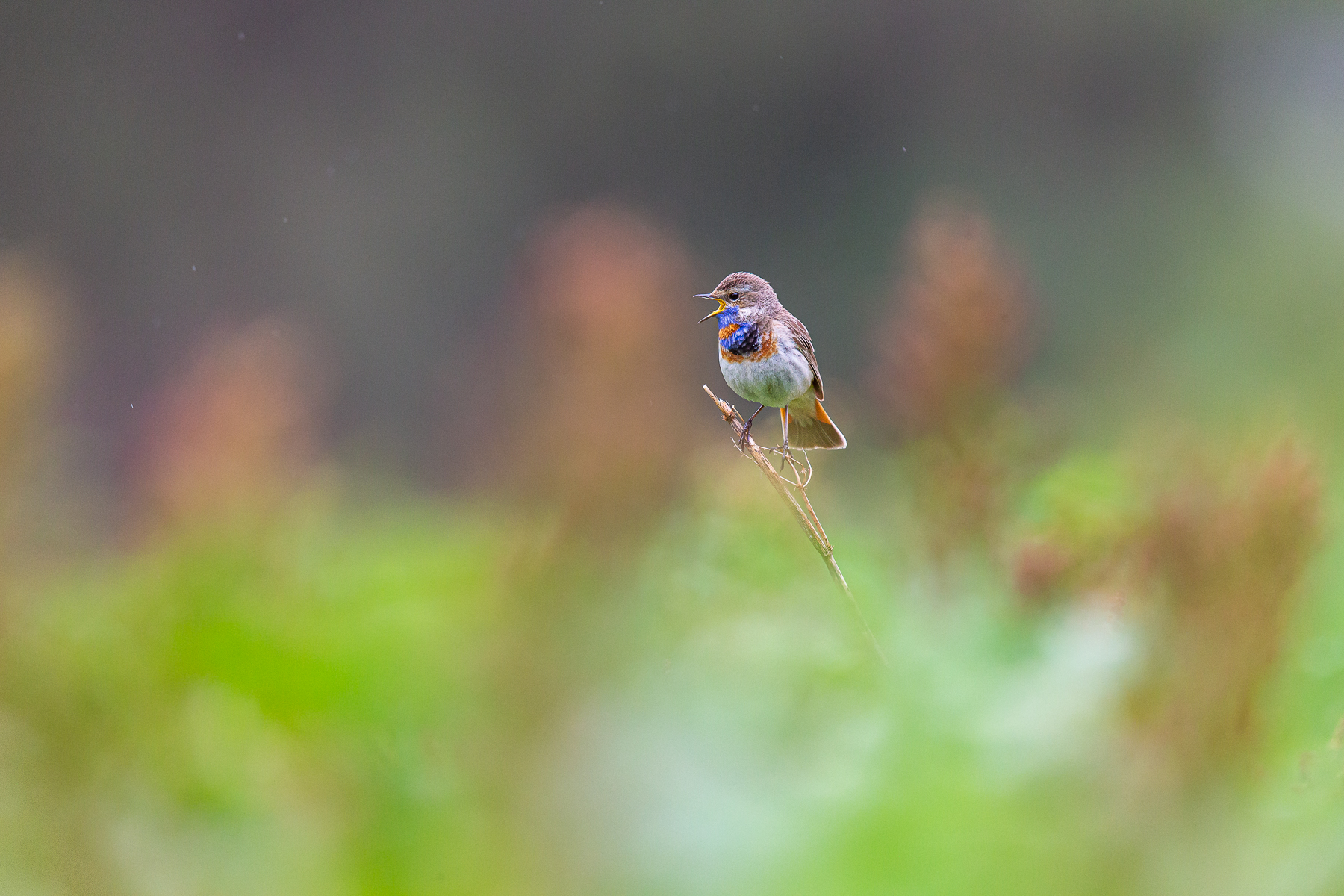 Les pentes nord et leurs vernes sont encore ensevelis sous une épaisse couche de neige, mais des aiguilles vert pomme habillent déjà les mélèzes. En montagne aussi, le printemps pointe enfin le bout de son nez. La lande alpine chante de partout : traquets motteux, merles à plastron, tariers des prés et autres pipits spioncelles se mesurent à coups de notes flutées et grincées parmi les rhododendrons. Soudain une nouvelle voix s’élève dans le concert matinal. Un phrasé d’abord hésitant, au timbre métallique, qui va en s’accélérant dans une cascade d’imitations et un mélange de sifflements variés. Puis le silence. Le temps s’arrête. Je rêve ? La musique reprend, au loin, mais l’oiseau demeure toujours invisible. Et je suis déjà fou de joie : ce chant varié appartient à la rarissime gorgebleue à miroir roux ! Contrairement à sa cousine de plaine au miroir blanc qui affectionne les zones humides, cette merveille arbore une bavette bleue tachetée de roux et vit dans les landes et les brousses d’arbustes nains des régions boréales et arctiques… et aussi parfois dans les Alpes, avec une minuscule population. Autant dire que croiser un de ces bijoux à la poitrine cobalt et rubis est un petit miracle…