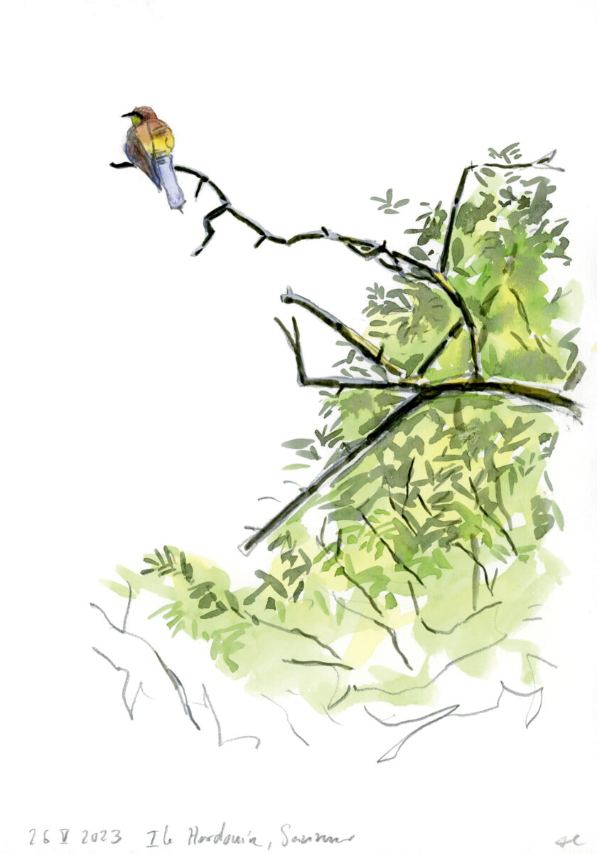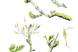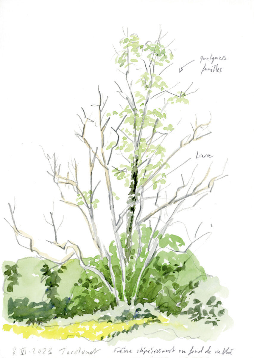 Je distingue en effet des branches atrophiées ou desséchées, dépourvues de sombres bourgeons caractéristiques. Je devine également que la cime des plus grands arbres donnera peu de feuilles. Ce phénomène de houppiers dégarnis sera immanquable dans le paysage d’ici à quelques semaines. Gobemouches, guêpiers et autres chasseurs d’insectes profiteront de ses providentiels postes d’affût. L’été ne ment pas sur l’état de santé des frênes. Quand surviendront les orages d’août, souvent chargés de grêle et accompagnés de vents rageux, notre Fraxinus sera le premier à se déplumer.
