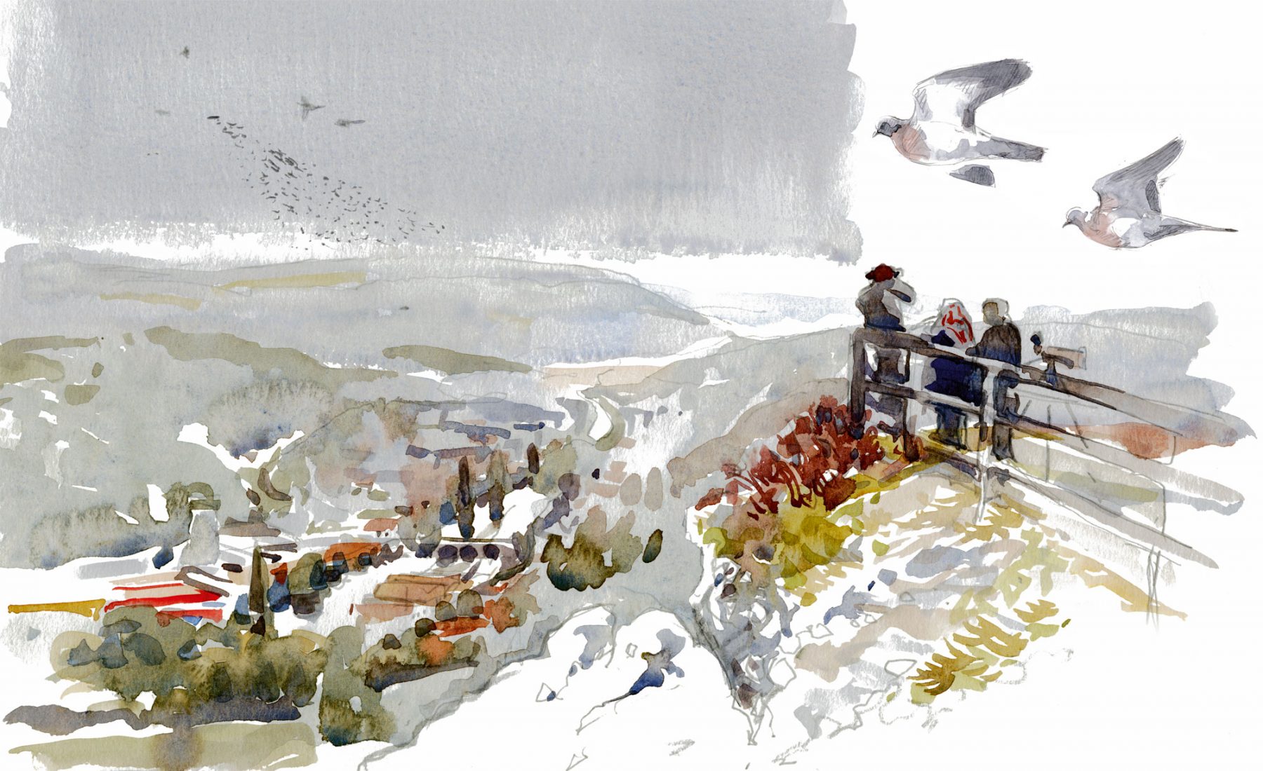 Une demi-heure après le lever du soleil, il y a en permanence au moins un groupe de pigeons à dénombrer : au loin, tout près, au-dessus de ma tête, en contrebas du belvédère… C’est incroyable. A 9h, je passe les 20 000 palombes. A 10h, 30 000. J’ai abandonné l’impossible dénombrement des pinsons. Chercher les dernières hirondelles et les premiers tarins suffit à m’extasier.