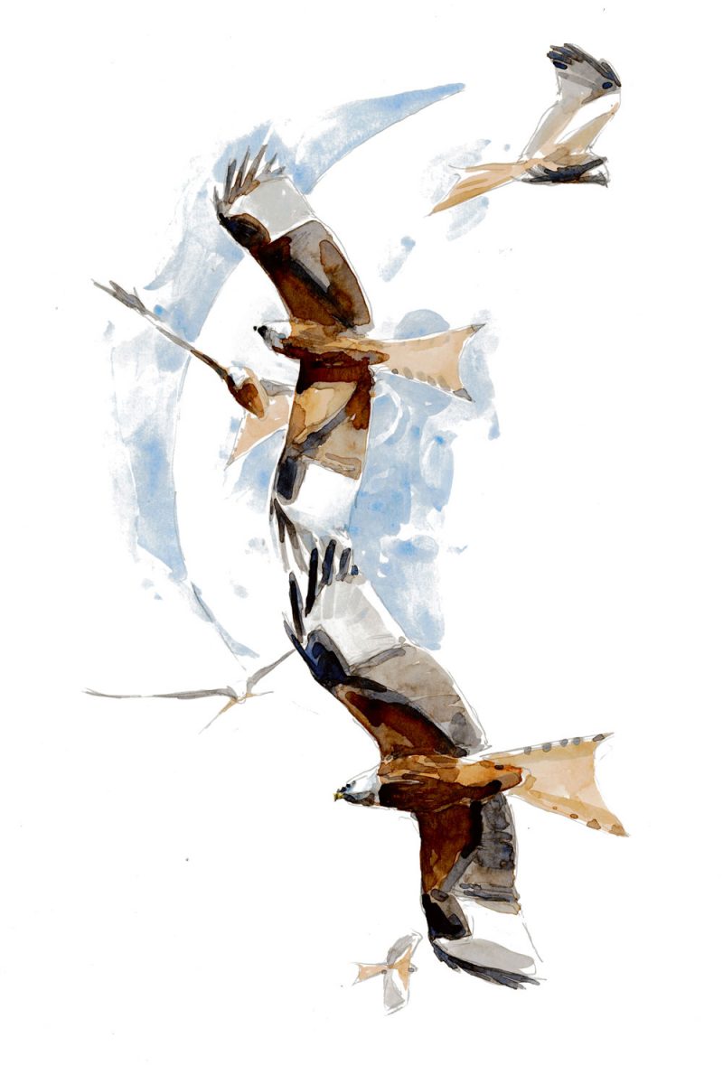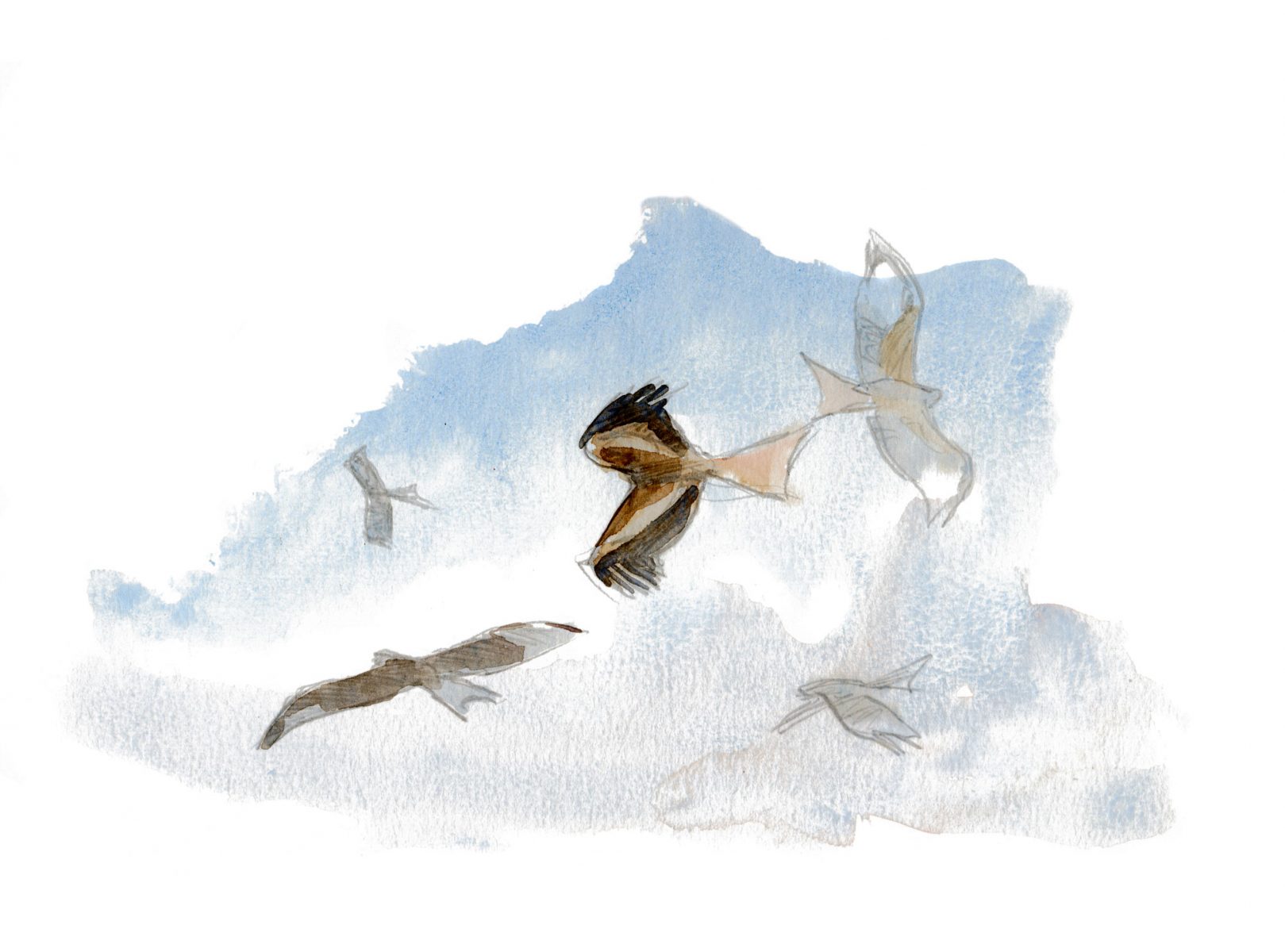 A l’instar de feu Milou les milans noirs nous quittent pour l’Afrique entre juillet et septembre. Leurs nuées quelquefois nombreuses égayent le ciel d’août en même temps que les cigognes. De fin septembre jusqu’aux premières vagues de froid, ce sont les milans royaux qui mettent les voiles vers la péninsule Ibérique ou le piémont pyrénéen. Parfois, des étiquettes colorées fixées sur leurs ailes renseignent sur le lieu de naissance ou d’hivernage où ils ont été marqués : Allemagne, France, Suisse, Espagne…