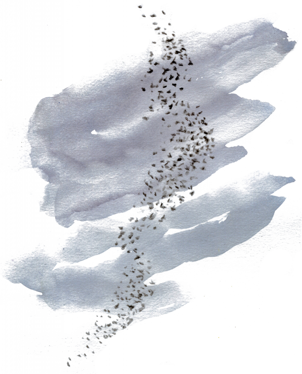 A l’est, les rougeurs de l’horizon se changent en une lumière intense qui annonce le point du jour. Des troupes de passereaux plus ou moins serrées et plus ou moins ondulantes surgissent de nulle part. Les ailes scintillantes accompagnées de cris doux annoncent les pinsons des arbres. Les obus au vol plus volontaire et aux cris explosifs sont des grosbecs. Au loin, le premier essaim de ramiers file comme une ombre.