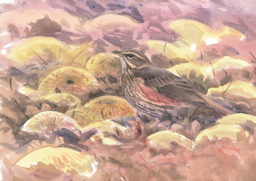 « Dans le jardin de Marthe, un grand et vieux pommier continue de perpétuer la vie bon an mal an. L’automne dernier a été productif et de nombreuses pommes tapissent le sol en ce cœur d'hiver. Les merles du quartier ou d’horizons plus lointains ne manquent pas cette occasion facile de faire bombance. Plus discrète, la grive mauvis est là aussi et c’est avec plaisir que je découvre son plumage mimétique parmi les feuilles mortes. Au chaud derrière la fenêtre, je me régale de ses attitudes et oublie le temps de quelques croquis que c’est sans doute la dernière fois que je viens ici… »