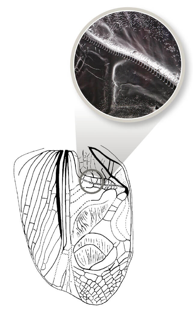 Une fois produit, le son est amplifié 40 fois par la vibration de la harpe, une pièce triangulaire ornée de nervures parallèles. Le miroir, une autre partie de l'élytre ronde et dépourvue de nervures, participe aussi à la résonance.