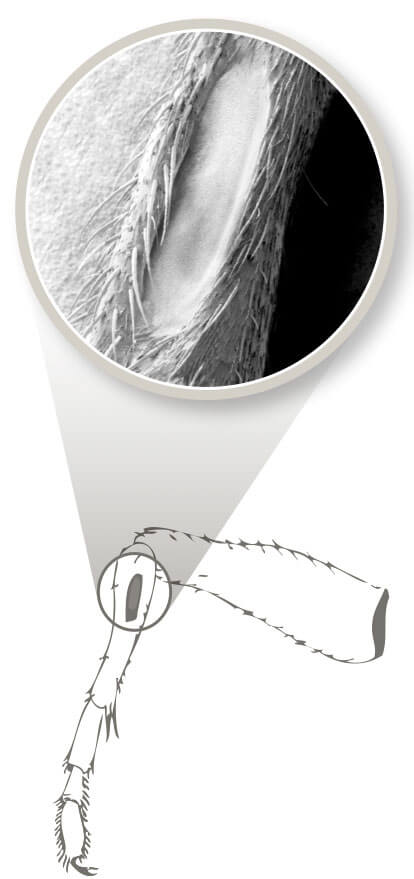 - Enfin, des soies filiformes extrêmement longues détectent les plus infimes courants d'air. Elles sont engainées à leur base dans une espèce de chaussette qui réagit au contact. Grâce à ce dispositif unique, le grillon peut sentir l'approche d'une araignée à plusieurs centimètres de distance.