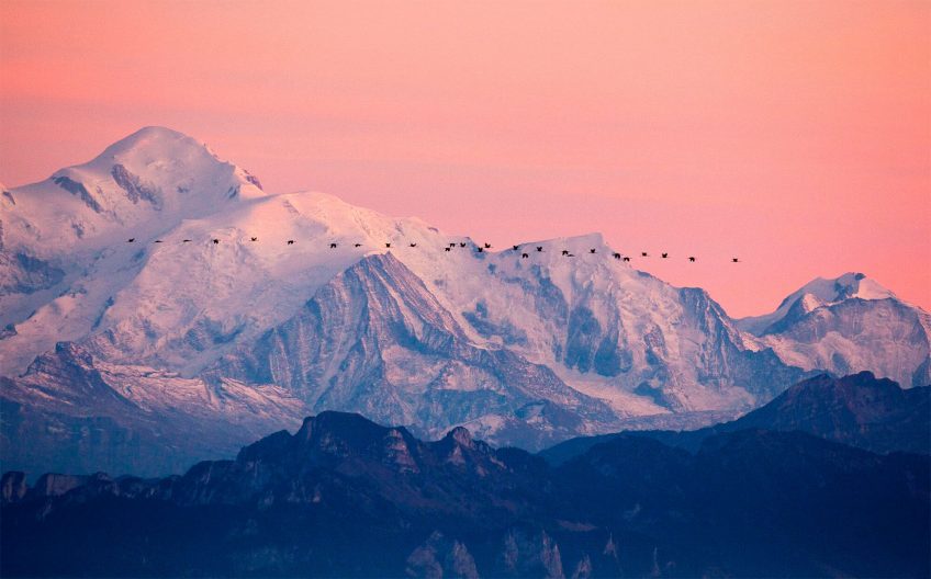 « J'aime bien cette saison avec ses temps changeants, ses lumières intimistes qui caressent la brume ou les feuillages en feu. C'est aussi le temps des passions. Des cerfs oubliant leur discrétion, des chamois hérissés sifflant d'un roc à l'autre. C'est pour ces derniers que j'étais parti quelques jours entre pâturages délaissés et falaises abruptes. Cette fois-ci, ils s'étaient amusés à me promener jusqu'au sommet sans me laisser la moindre chance de faire une image. Un peu déçu et fatigué, je me suis assis sur les hauteurs, laissant mes rêves s'échapper dans les couleurs mouvantes qui suivent le coucher du soleil. Et c'est ainsi que j'ai vu au loin s'étirer un filament souple d'oiseaux. Des grues cendrées ondulaient en suivant leur chemin de migration entre mon promontoire et le massif du Mont-Blanc baigné de crépuscule. Sans ces fameux chamois, je n'aurais pas poussé mon chemin jusque-là. Je suis rentré bredouille quant à mes espoirs, mais comblé par ce que je n'attendais pas. Il en va souvent ainsi dans la nature... et peut-être aussi dans la vie ? »