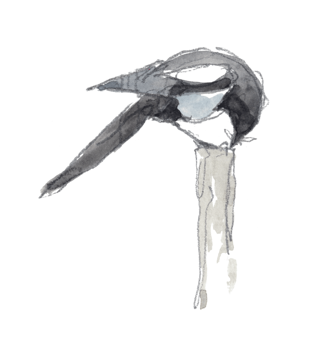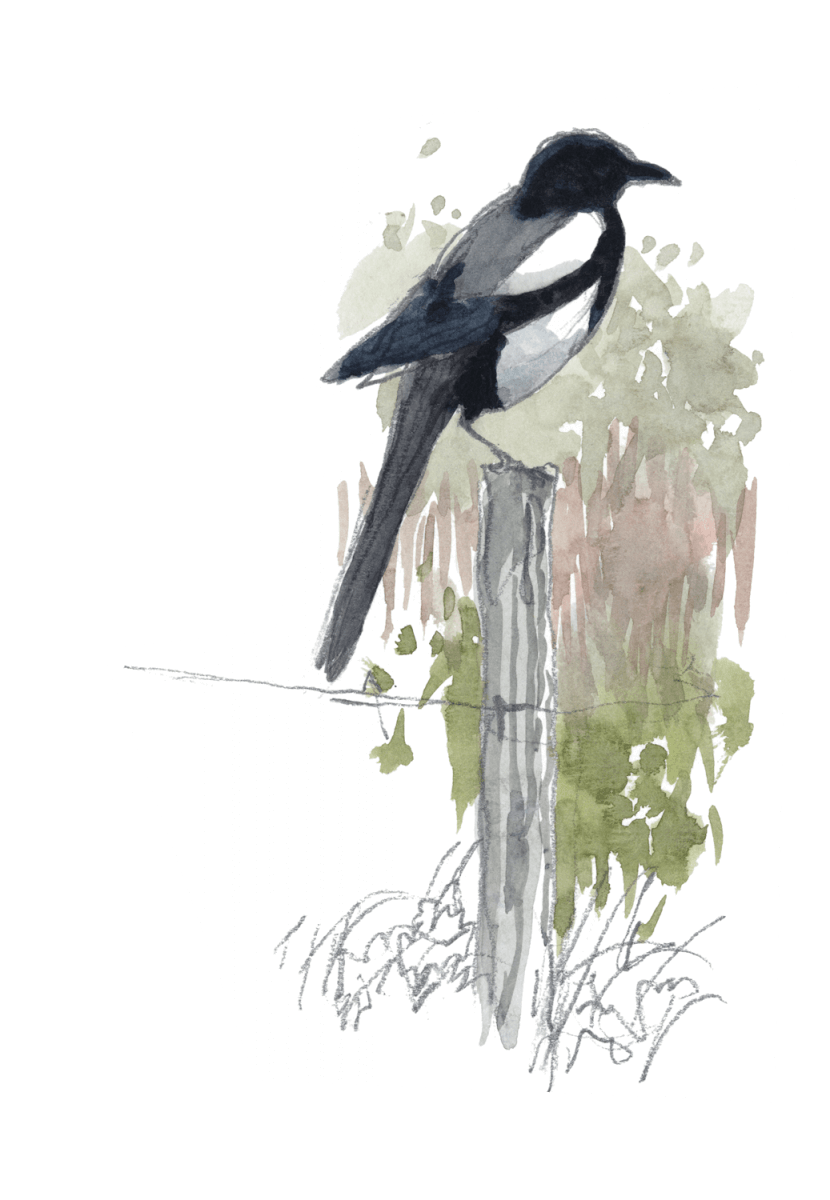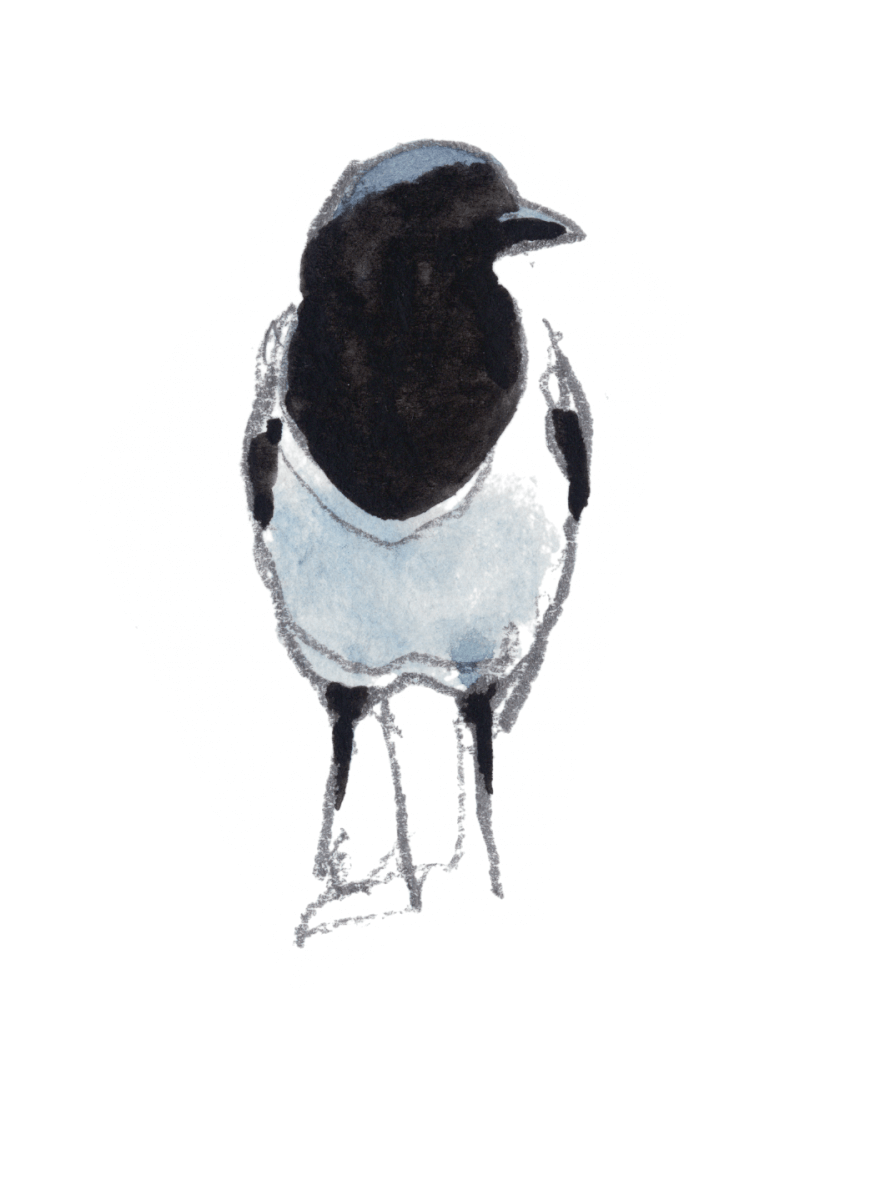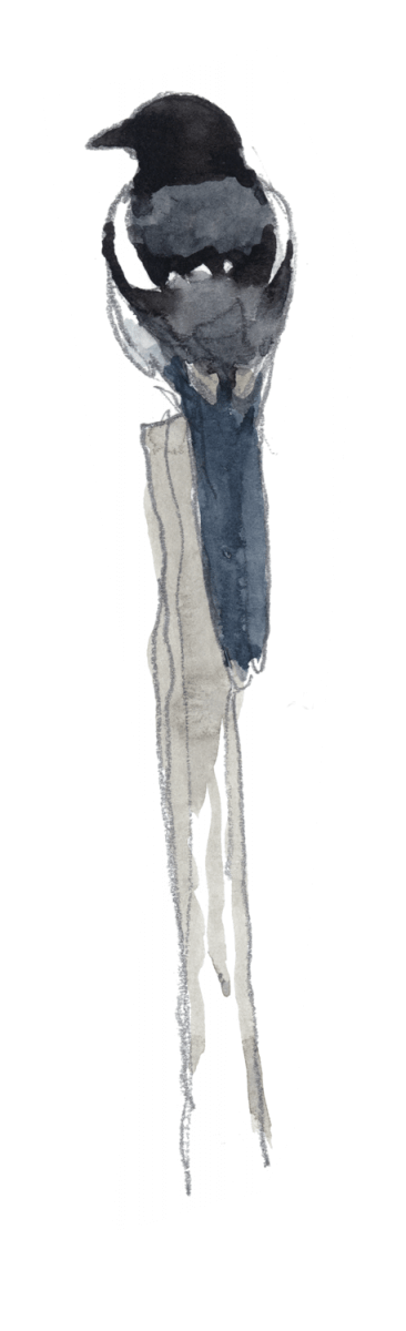 Mi-décembre, l’hiver se prépare. Une bise glaciale laboure la campagne monochrome et s’engouffre à travers les haies dépouillées. Portés par de courtes ailes papillonnantes, sept oiseaux survolent les champs en file indienne. Les coups de vent bousculent la procession qui vacille comme un bateau à la merci d’une mer démontée, puis se rabat dans un taillis. Queue de perruche démesurément longue, frac noir et blanc, l’élégance est de mise dans cette coquette équipée. Le bruit aussi : par leurs jacassements incessants, les pies bavardes se font remarquer.