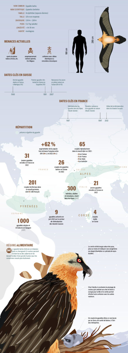 Gypaète barbu, sa situation en Suisse et en France