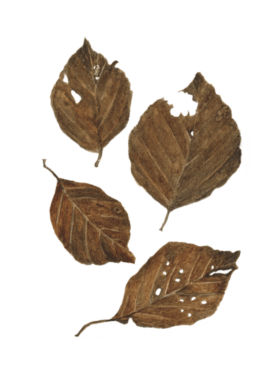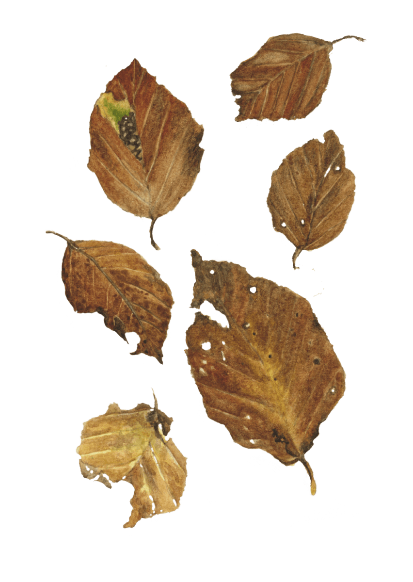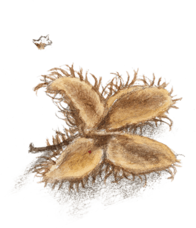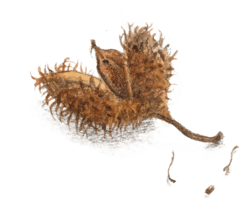 Bien protégée dans une carapace dure et hérissée de piquants, la faîne attend. La sécheresse et l’humidité travaillent peu à peu l’enveloppe qui ouvre ses quatre pétales. Un jour, la graine du foyard glisse de son cocon velouté parmi les feuilles mortes. Un écureuil, un mulot, une souris pourraient passer et la grignoter. Un pinson, un verdier, un geai, une corneille pourraient l’avaler, quelque insecte la dévorer. Le vent la chahute un peu, l’eau de pluie l’emporte ici ou là, encore un bout de chemin entre les pelotes d’un renard et la graine de hêtre tombe finalement dans un petit trou.