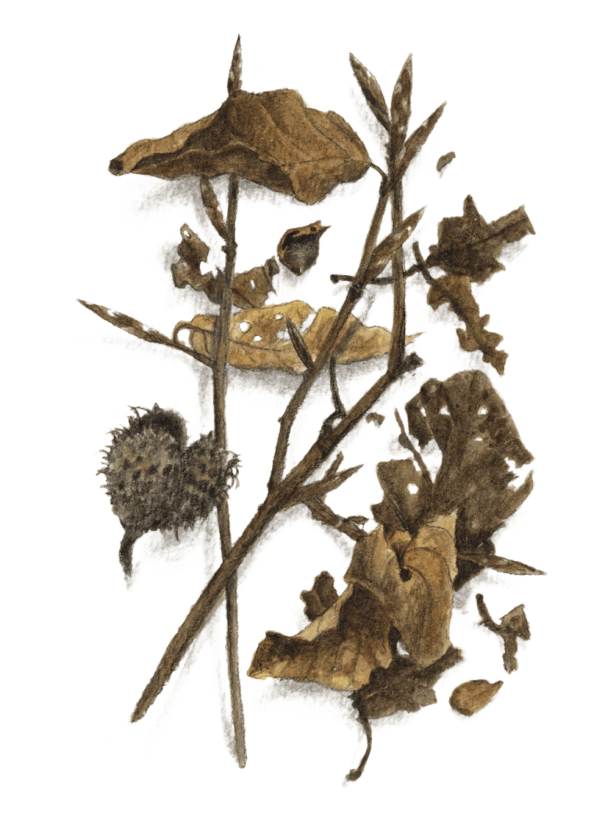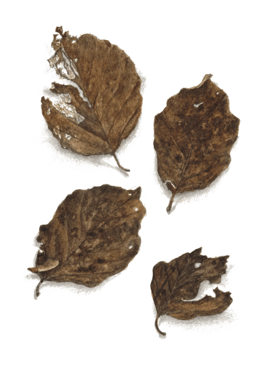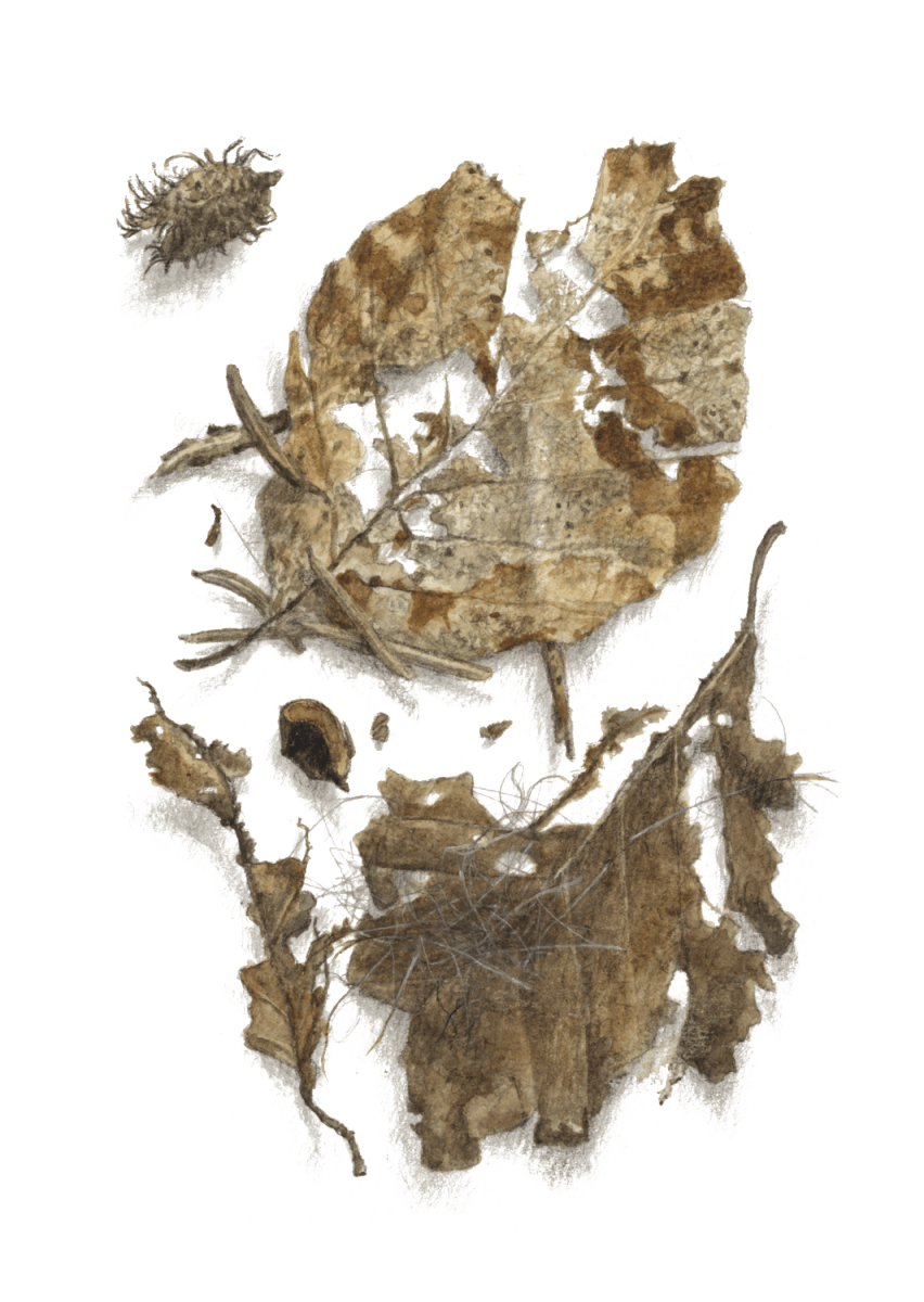 Bien protégée dans une carapace dure et hérissée de piquants, la faîne attend. La sécheresse et l’humidité travaillent peu à peu l’enveloppe qui ouvre ses quatre pétales. Un jour, la graine du foyard glisse de son cocon velouté parmi les feuilles mortes. Un écureuil, un mulot, une souris pourraient passer et la grignoter. Un pinson, un verdier, un geai, une corneille pourraient l’avaler, quelque insecte la dévorer. Le vent la chahute un peu, l’eau de pluie l’emporte ici ou là, encore un bout de chemin entre les pelotes d’un renard et la graine de hêtre tombe finalement dans un petit trou.