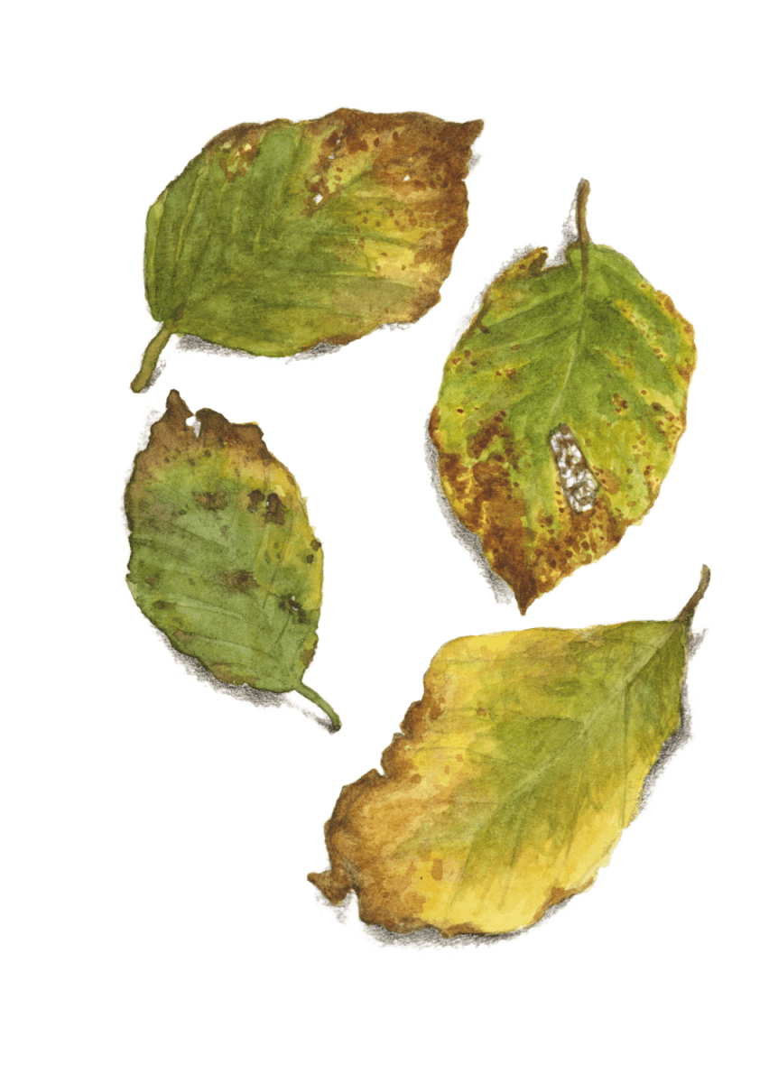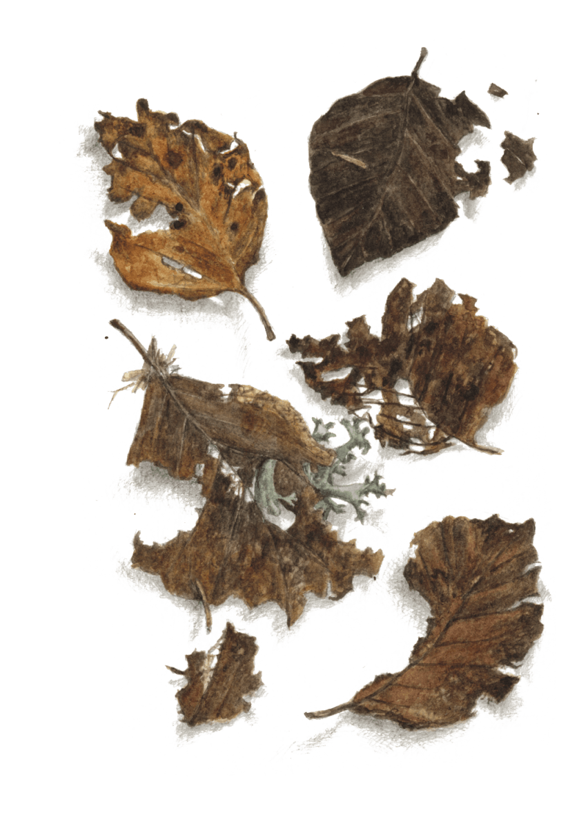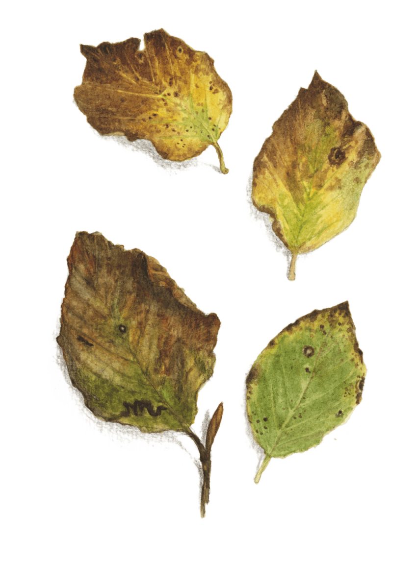 Au pied de son arbre, Jacques Rime a peint mois après mois les métamorphoses des feuilles, au début encore vertes et dorées, puis de plus en plus brunes, grignotées et ratatinées… Pendant ce temps, il a aussi tendu l’oreille. Et voici l’histoire que son arbre lui a racontée :