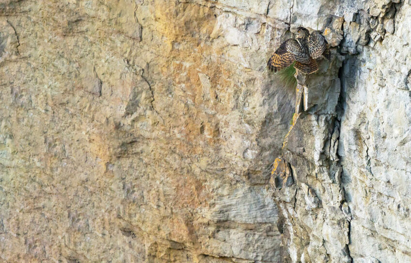 Amélie réalise à quel point le plus grand rapace nocturne peut sembler minuscule dans les immenses vires. Et l’efficacité avec laquelle son plumage le dissimule à merveille dans les gris, les ocres et les ombres du calcaire. Notre vœu est de continuer à veiller sur les grands-ducs de cette vallée, pour que plus jamais ils ne disparaissent.