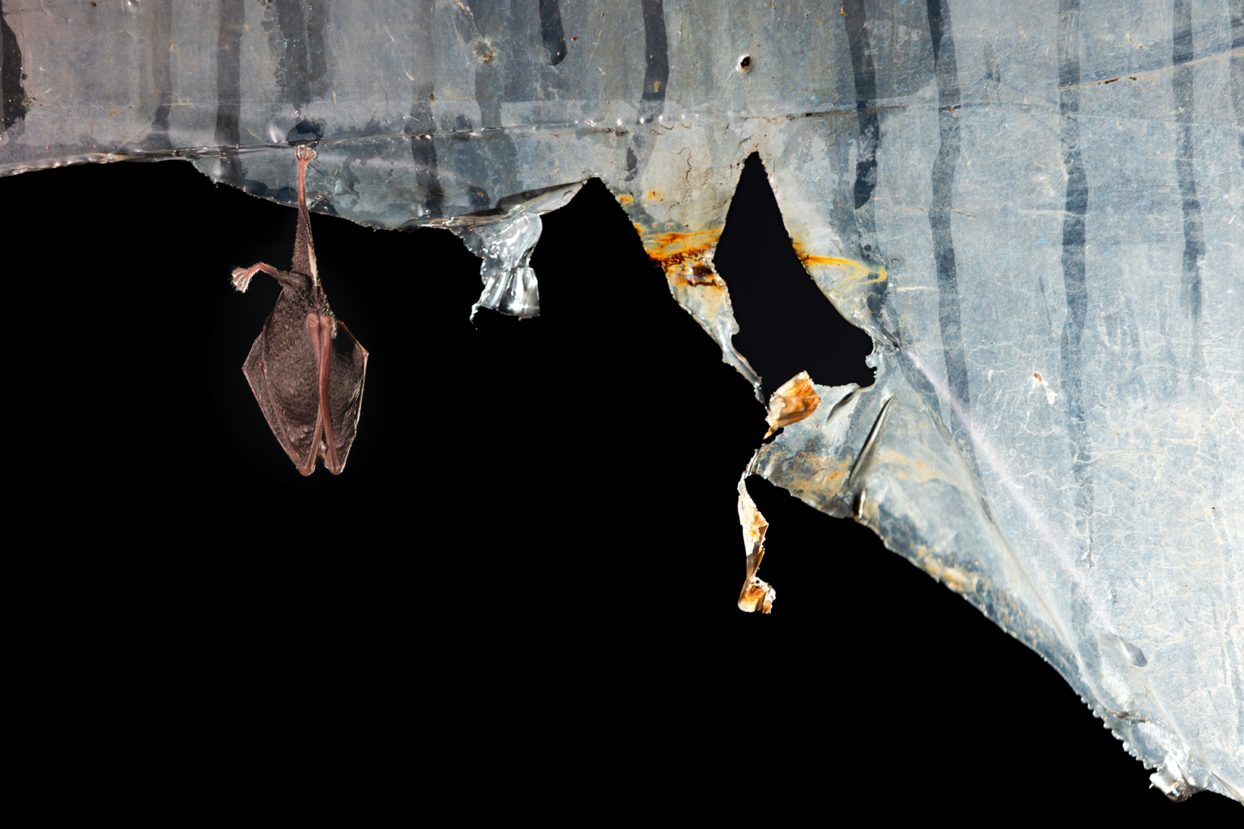La photo ci-dessous a été prise en février 2025, dans une ancienne carrière d’extraction de calcaire en Dordogne. Des bâches en plastique sont restées de l’époque où elle abritait une champignonnière : aujourd’hui, les cavités sont remplies de déchets. Des petits rhinolophes, quasi exclusivement, s’y accrochent. Alors que nous avancions vers une de ces bâches dont le plastique était déchiré, nous avons réalisé que l’un des lambeaux était en fait une chauve-souris ! Au début, nous croyions que sa patte, dans une drôle de position, était cassée, mais s’il y avait eu une fracture, elle aurait été gonflée. Au vu des gouttes d’eau sur la bâche, je pense que le petit rhinolophe a simplement glissé. Le fond noir n’est pas dû à l’utilisation d’un flash : c’est que, derrière, il y a 1 km de tunnel ! J’ai rarement fait des photos de petits rhinolophes sur des bâches aussi bien dégagées. Je n’ai pas pris d’autres clichés dans cette grotte – ou alors ratés, évidemment... »