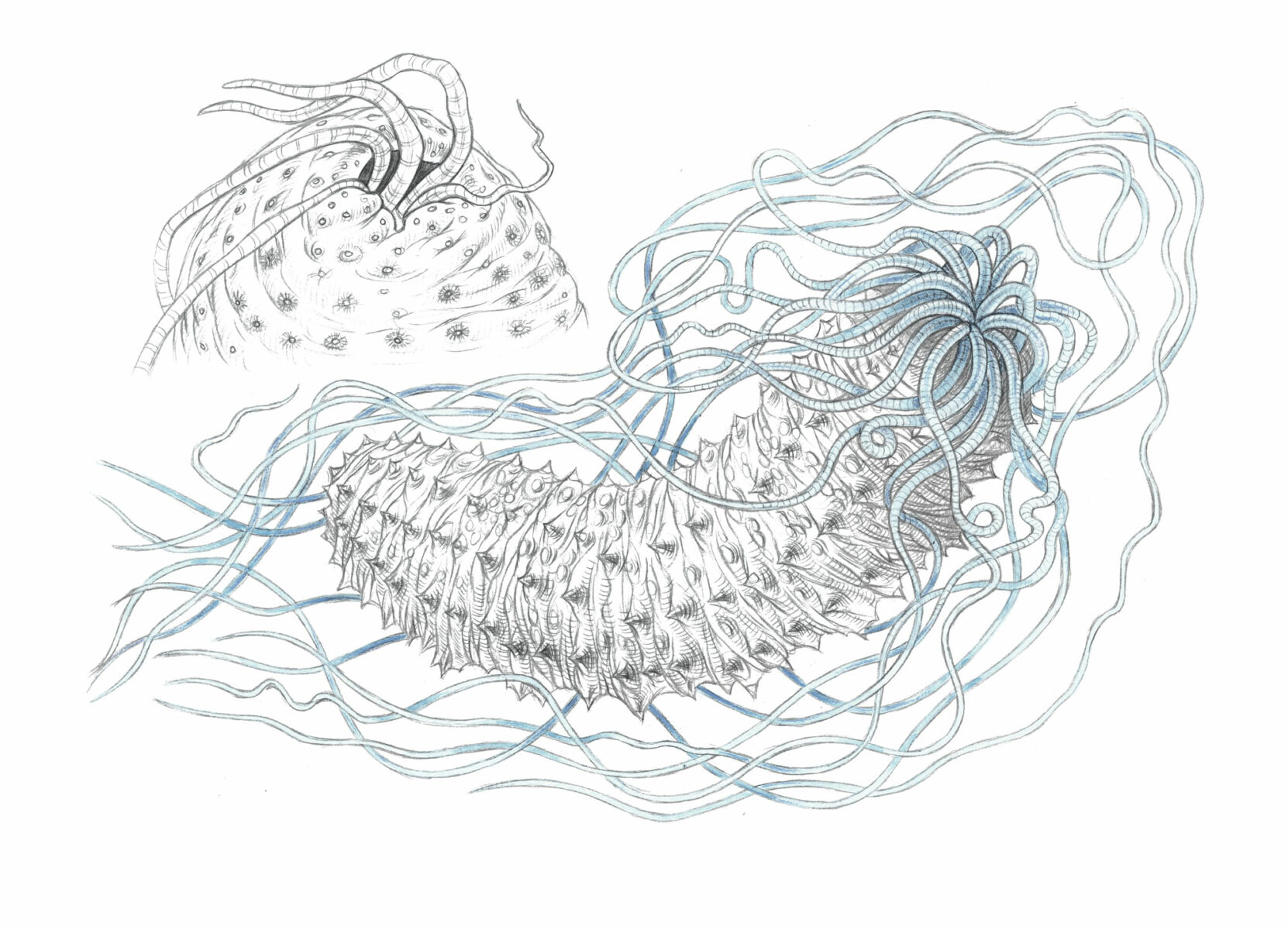 L’holothurie nettoie le fond des océans en filtrant les sédiments pour en digérer les matières organiques. Pour cela, elle ramène à sa bouche le sable grâce à une lèvre circulaire pourvue d’une vingtaine de tentacules rétractiles. A l’autre extrémité, ses excréments expulsés en chapelets ont un pH élevé et sont riches en carbonate de calcium. Ils contrebalancent donc localement les effets nocifs de l’acidification des océans. Une aubaine pour les coraux et autres animaux à coquille.