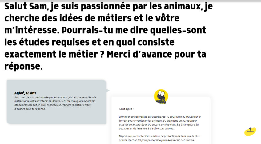 Vos enfants ne cessent de vous poser des questions sur la flore ou la faune, ce sont de vrais passionnés ! Vous pouvez leur suggérer de poser leurs questions à Sam ! Ils y trouveront les réponses ! Tiens, comment devenir naturaliste par exemple ? Pour ça aussi, Sam a la réponse, vite rendez-vous sur le forum !