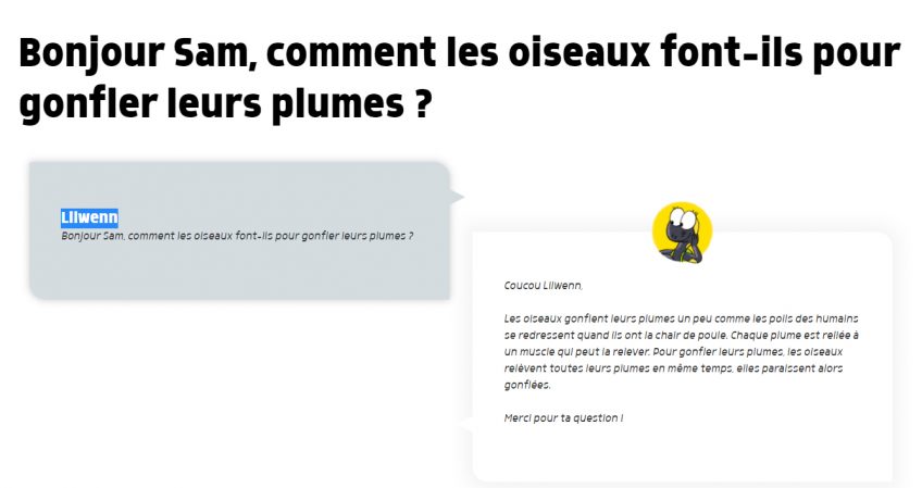 Si vous séchez pour répondre aux questions plus ou moins pointues de vos enfants sur la flore ou la faune, vous pouvez leur suggérer de poser leurs questions à Sam ! Vous pouvez aussi jeter un œil à notre forum où vous trouverez déjà plein de réponses... Par exemple comment les oiseaux font-ils pour gonfler leurs plumes ? Une idée ? Non ? Alors direction le forum !