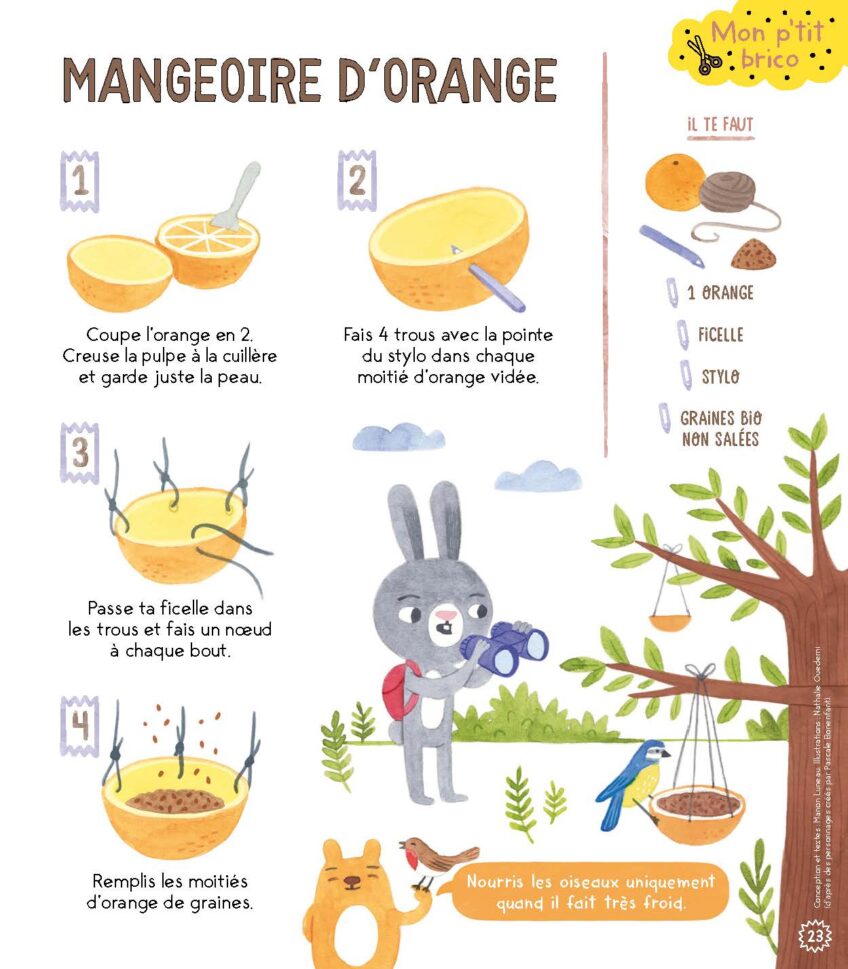 Quand il fait très froid, vous pouvez aider les oiseaux à se nourrir. Pour cela préparez quelques graines et posez-les sur une mangeoire originale... En orange ! Très facile à réaliser avec vos enfants. Une orange, de la ficelle, un stylo et des graines bio. Buvez le jus et gardez le contenant !