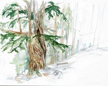 L’hiver toque à la porte, le soleil se lève tardivement, ses rayons se fraient un chemin entre les branches des arbres dénudés. Leur course universelle se termine sur un tapis givré, recouvert de branches et de feuilles de hêtre décorées de dentelles glacées. Sur le talus pentu sont dispersées quelques galettes de neige. Chaque pas crisse sur ce tapis hivernal. On aperçoit entre les sapins blancs et les épicéas la silhouette vert sombre du héros du matin, un bel arbre de 3 m de hauteur, à l’écorce écailleuse, un if. Les ifs ne font pas leur âge. Avec cette taille, il a au moins soufflé ses 50 premières bougies, quelle forme !