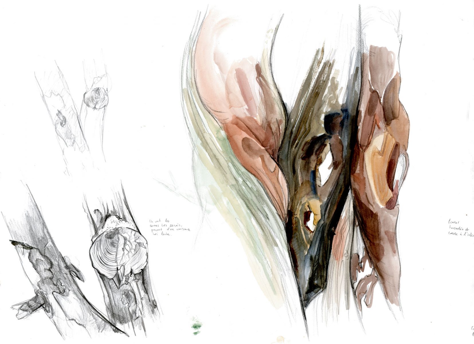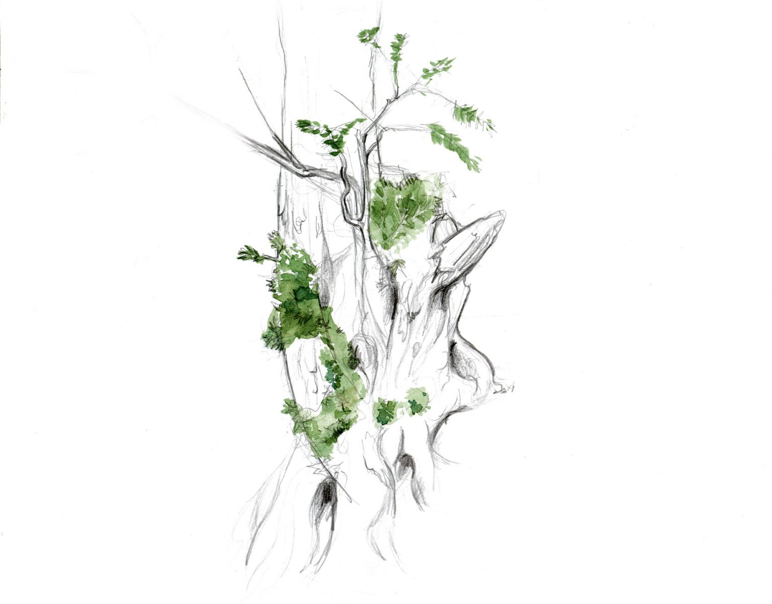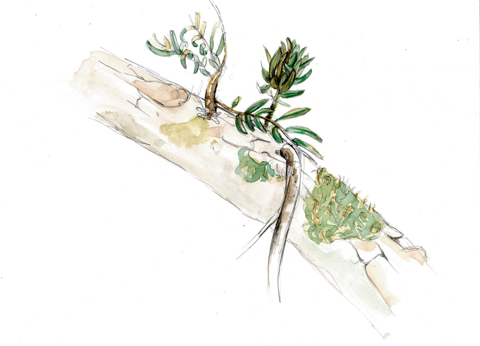 Ces rejets sont fréquents chez les feuillus mais atypiques pour un conifère. Sa surface se rajeunit également en continu, de jeunes branches portant des aiguilles souples et fines croissent à même l’écorce. Si elles se font trop brouter, elles formeront alors un duvet vert sur le tronc et modèleront le bois sous l’écorce comme une peau de crocodile.