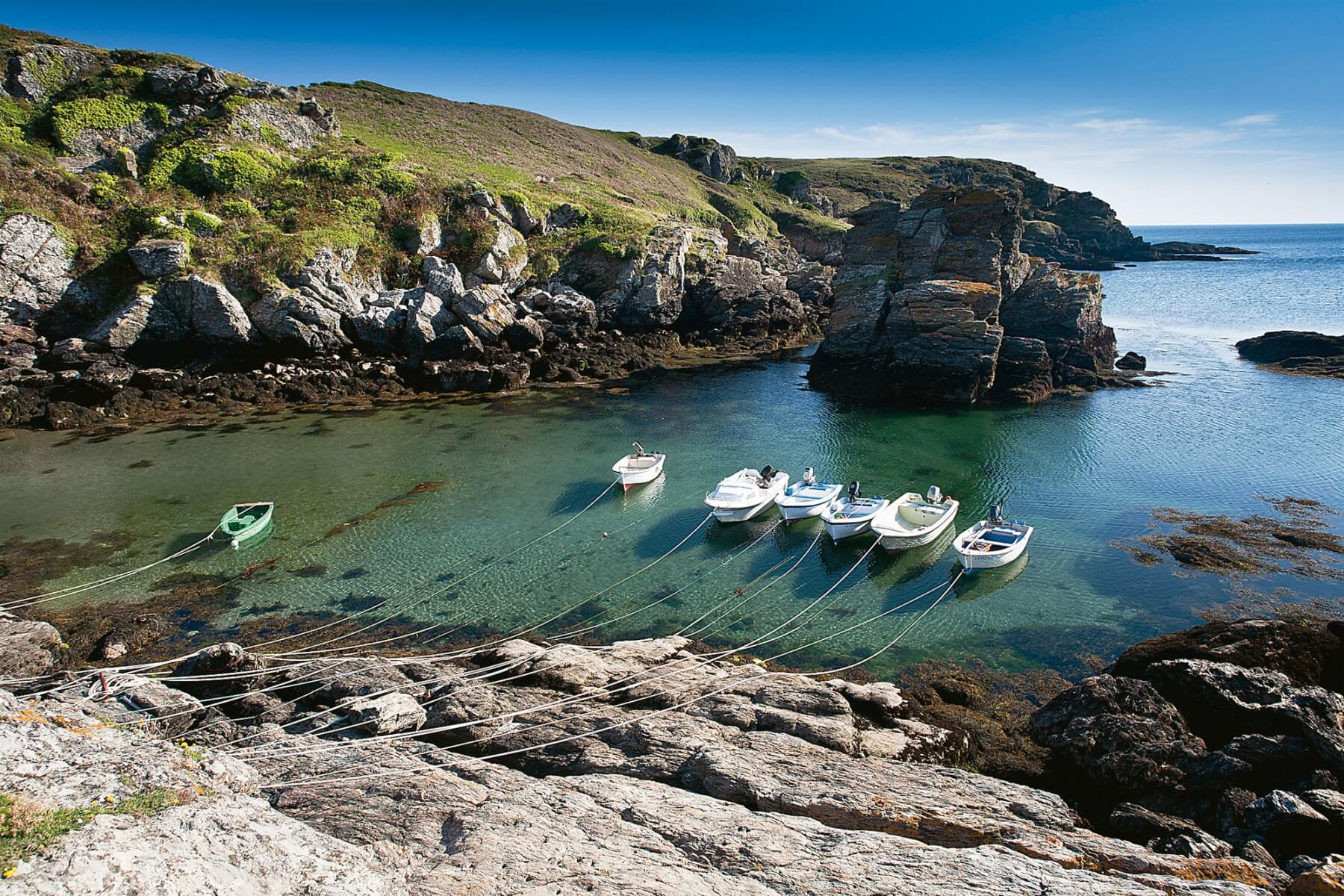Cap à l’ouest. Autour du phare de Pen Men, la lande s’étend à perte de vue. C’est ici le royaume des bruyères, et en particulier de la « vagabonde », qui marque ici la limite nord-ouest de son aire de répartition. A la pointe, des falaises incrustées de micas éblouissants plongent à pic dans l’océan. Des cormorans huppés se posent sur les corniches, pas effrayés par le puissant coup de corne du ferry. Venu de Lorient, il s’annonce au large de Port Tudy, soulignant le paradoxe de cette île qui a su rester sauvage malgré son attrait touristique.