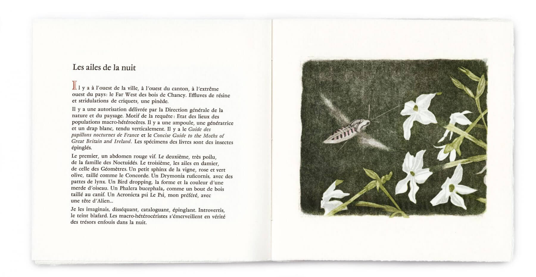 Graveur, écrivain, typographe, tous ont en commun de partir sur une page blanche et d'y laisser l'empreinte de leur art. Sur le terrain, l'écrivain saisit ses impressions d'observations, le graveur imprime ses images et les imprimeurs impriment à leur tour l'ensemble d'un livre au titre tout trouvé. Impressions est l'aboutissement de cette belle collaboration, un ouvrage d'art composé avec une grande rigueur et cousu main à 28 exemplaires.