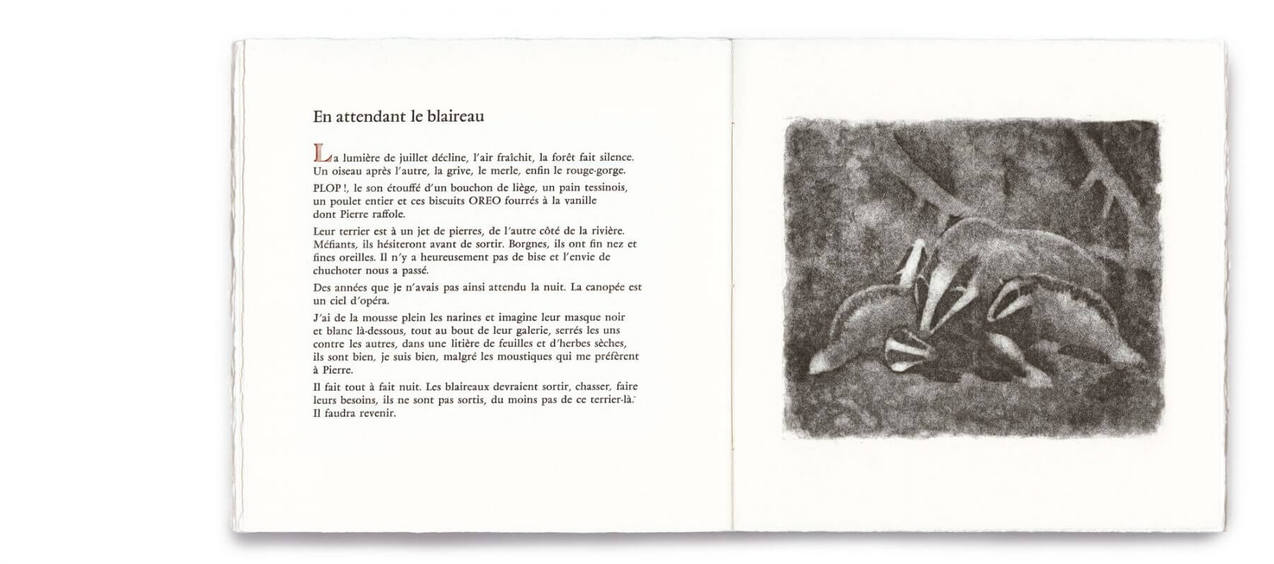 Pour l'écrivain lausannois Blaise Hofmann, la nature est aussi source d'inspiration. Mois après mois, il accompagne le graveur sur le terrain pour observer les animaux ou simplement la lune. De leur connivence naît une série de 12 gravures auxquelles répondent autant de textes malicieux. Les deux artistes composent ainsi un bestiaire très personnel avec foulque, écrevisse, hermine, salamandre ou encore blaireau. Mais que vont devenir ces couleurs et ces mots finement ciselés ?