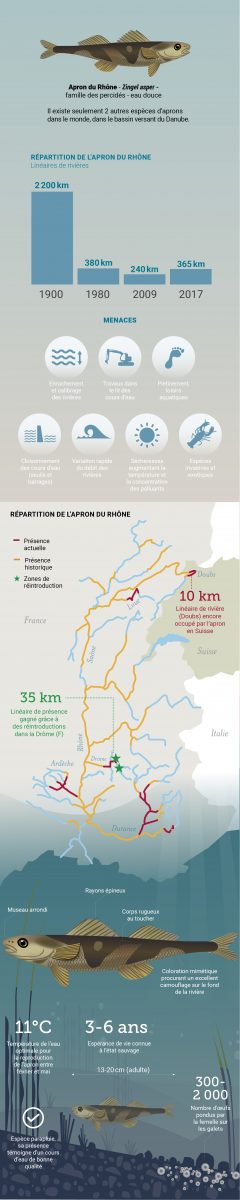 Les tests de réimplantation ont démarré en 2008 sur la Drôme. Les aprons réintroduits se maintiennent et des études génétiques attestent de leur reproduction dans le milieu naturel. Ces expérimentations arrêtées en 2018 sont donc encourageantes. Notre action se focalise sur le rétablissement de la libre circulation des poissons dans les cours d’eau. Grâce notamment à la construction de passes permettant à l’apron de franchir les seuils et les barrages. Et si l’apron passe, tous les poissons passent ! Quand c’est possible, l’effacement partiel ou total de ces obstacles est encore plus satisfaisant. Enfin, la gestion du débit des rivières sujettes à un régime artificiel – lié à l’hydroélectricité – est cruciale.