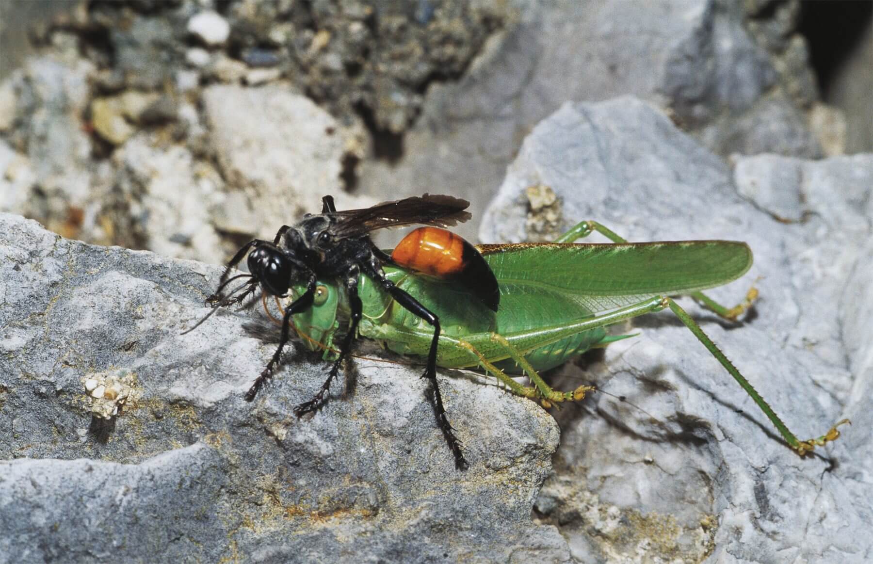 Parmi tous ceux qui se ravitaillent désormais en nectar, certaines guêpes ont adopté des mœurs étonnantes. Elles paralysent une ou plusieurs proies avec leur aiguillon venimeux. Ensuite, elles les enterrent dans une galerie où elles déposent également un œuf. Une fois éclose, la larve se nourrit des provisions amassées dans sa cellule avant de se métamorphoser en insecte ailé.