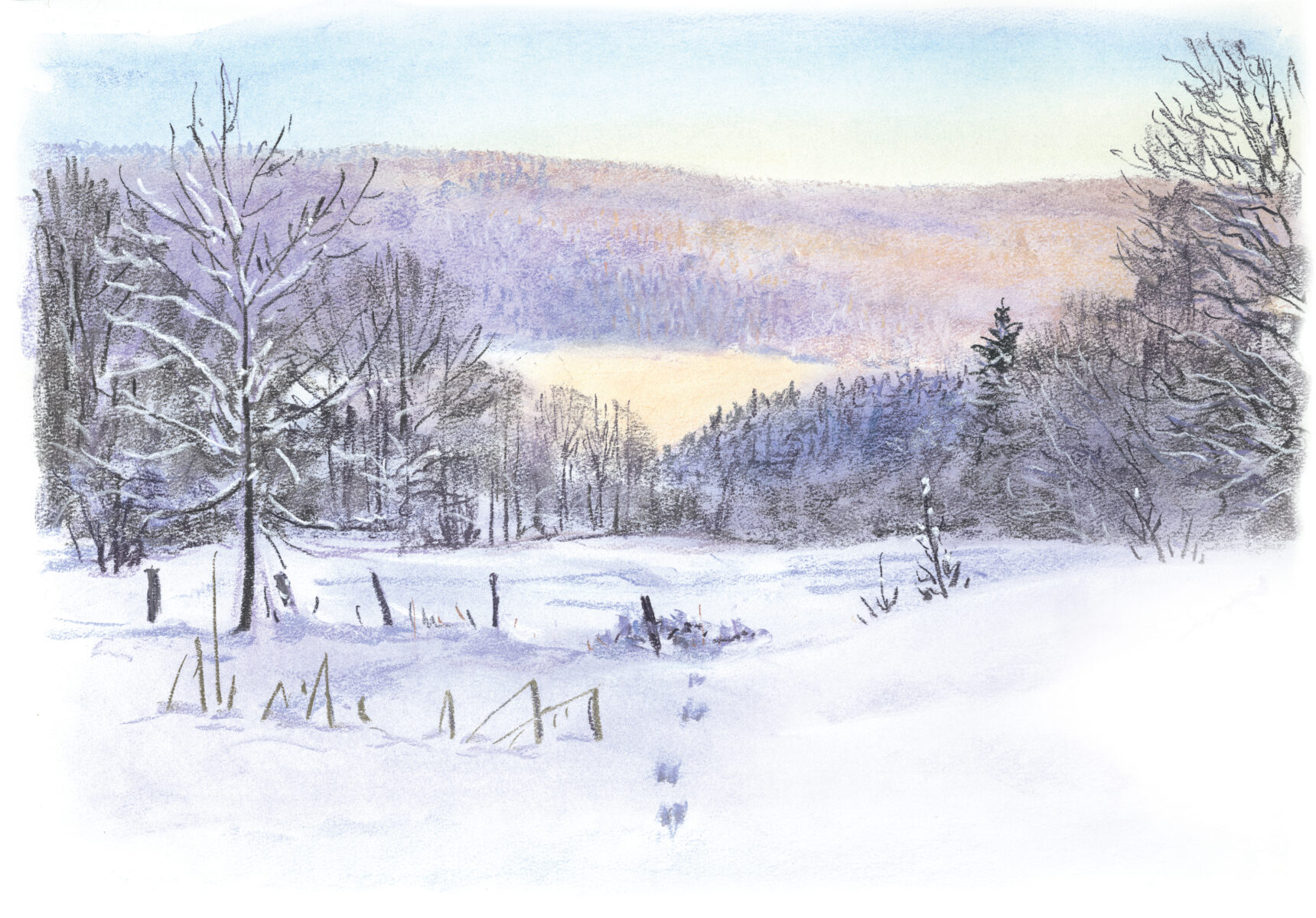 Le jour se lève sur un décor tout neuf. Cette nuit, la neige a enveloppé forêts et prairies d’une épaisse couverture immaculée. Les premiers rayons du soleil enflamment les flancs de la colline de reflets orange et pourpre. La campagne alentour a revêtu un douillet manteau de silence. Les dernières feuilles de bouleau forment de lumineuses lettres d’or, calligraphiées à la surface de cette immense page blanche.