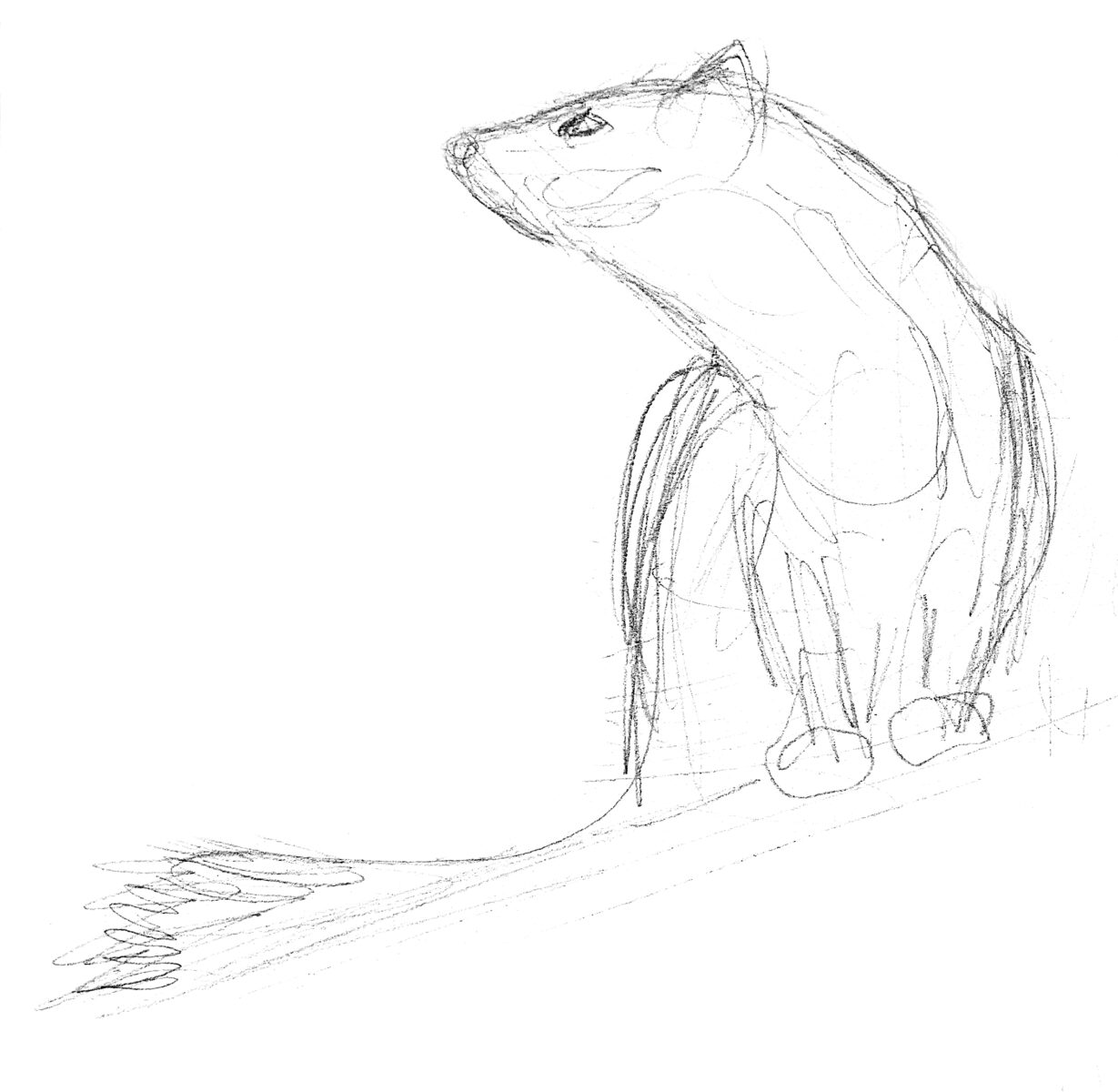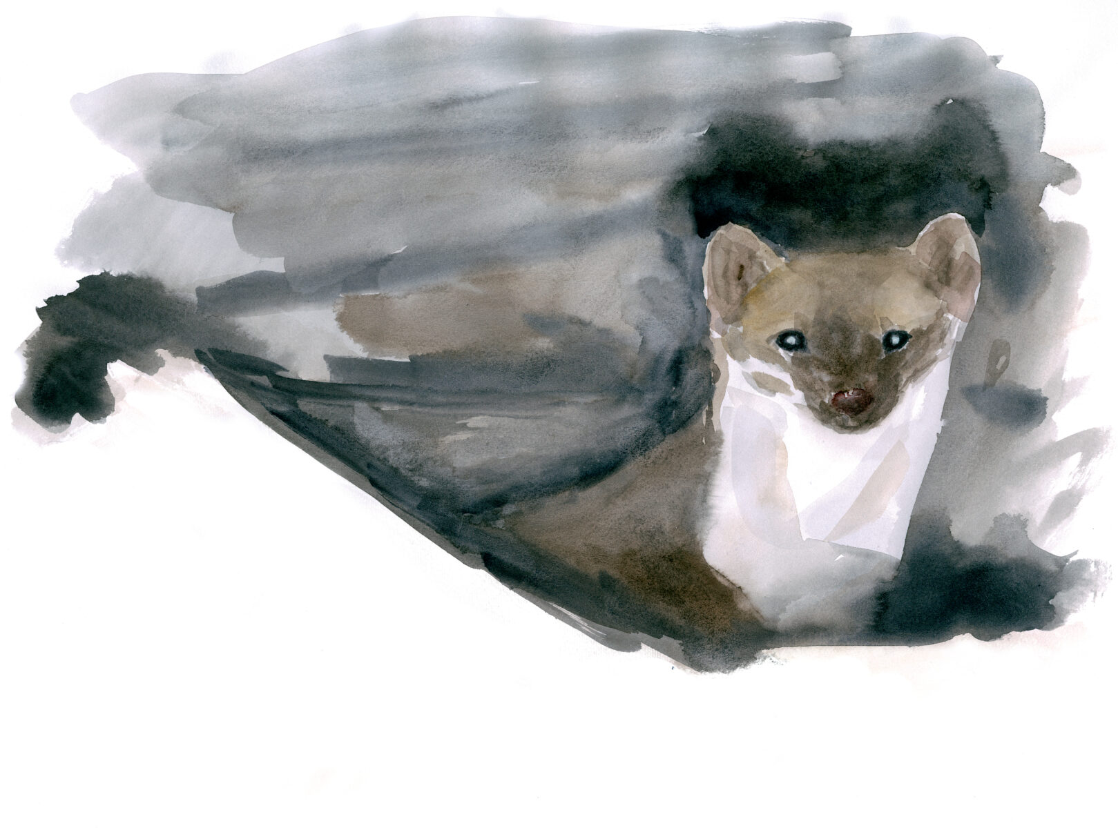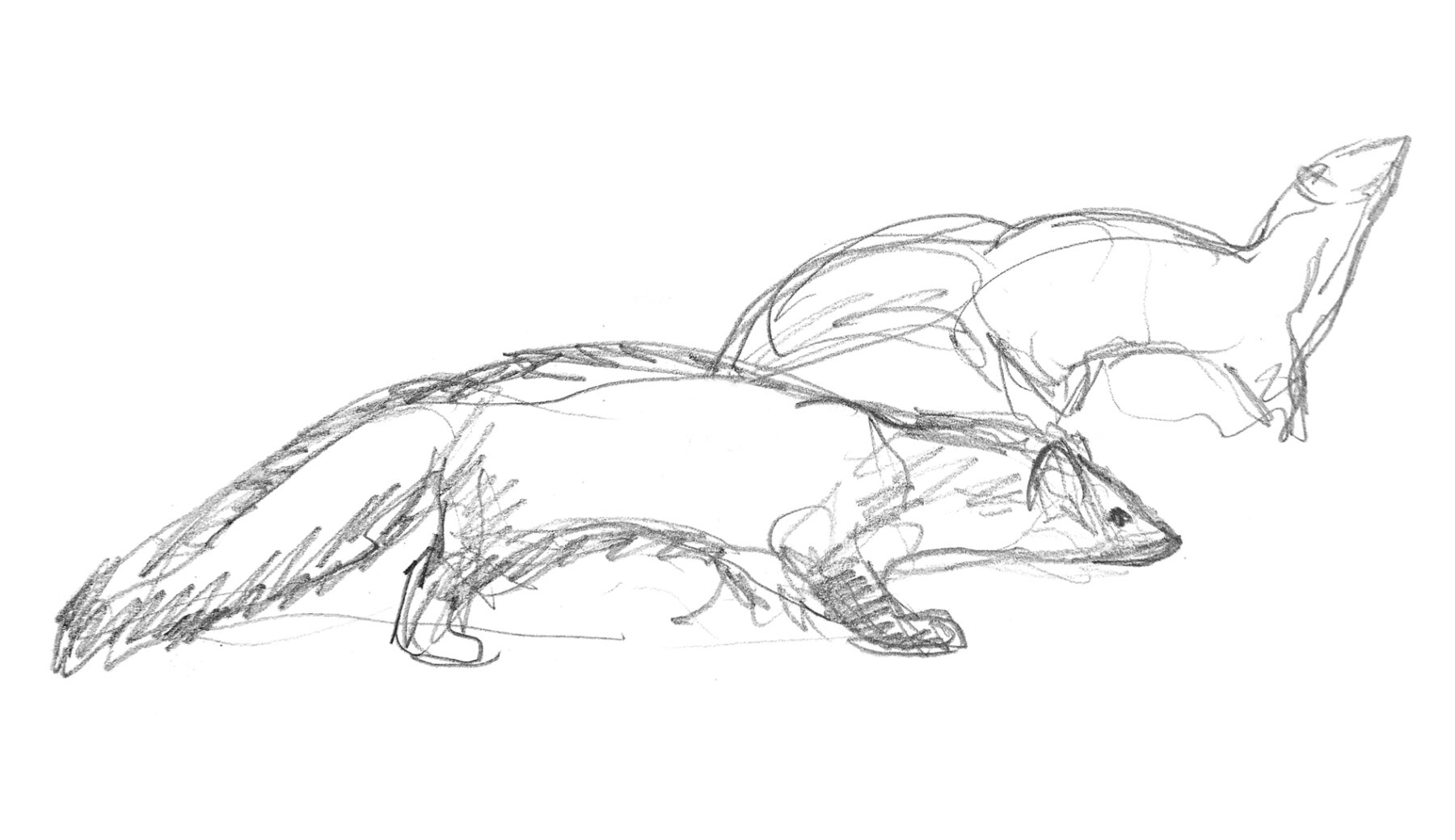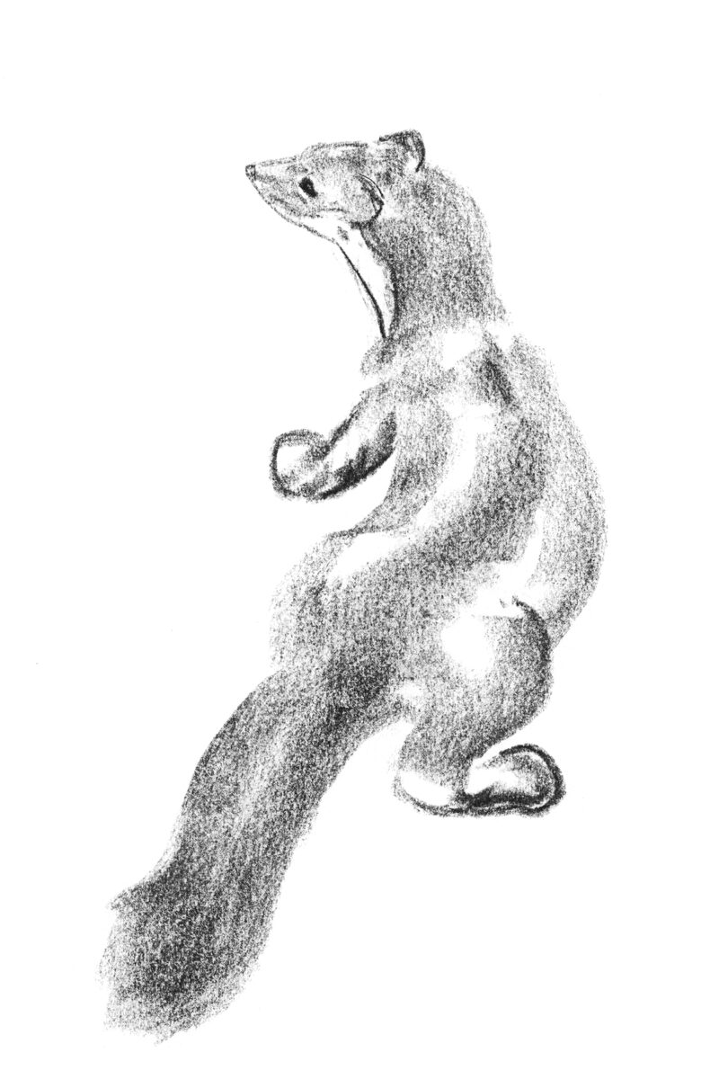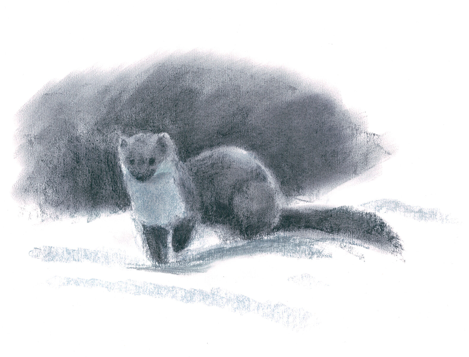 Le chemin rejoint à nouveau la maison pour en longer la façade. Comme la plupart des mustélidés, l’auteure de ces traces aime suivre les éléments du paysage lors de ses déplacements. Et puis, en hiver, elle a tout à gagner à ne pas trop s’éloigner des habitations. Elle y trouve un abri contre le froid et les prédateurs ainsi qu’une alimentation abondante. D’ailleurs, le chapelet d’empreintes fait un détour sous le vieux pommier de la cour. Mais l’automne est terminé, fini les banquets de pommes fondantes et les ventrées de prunes juteuses. Après avoir consommé majoritairement des fruits durant la belle saison, la petite chasseresse va devoir se tourner vers un régime plus carnassier. Ça tombe bien, c’est justement l’époque où souris et rats se réfugient dans les murs et sous le toit. Gare à eux, elle ne leur fera aucun cadeau ! Discrète, habile, intelligente, elle traque si bien les rongeurs que les Romains l’apprivoisaient parfois pour en débarrasser leurs demeures, avant que les chats venus d’Orient ne la supplantent.