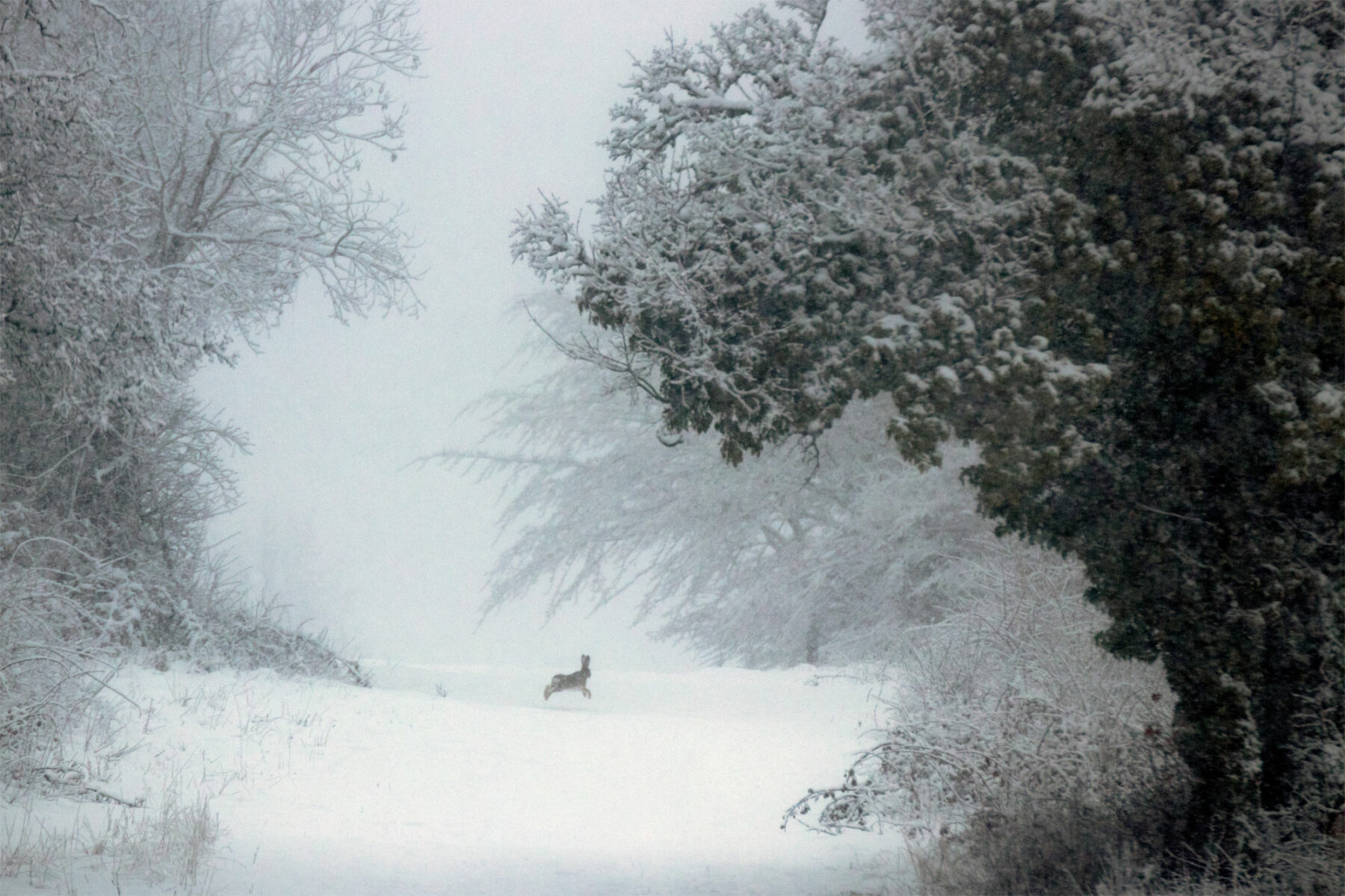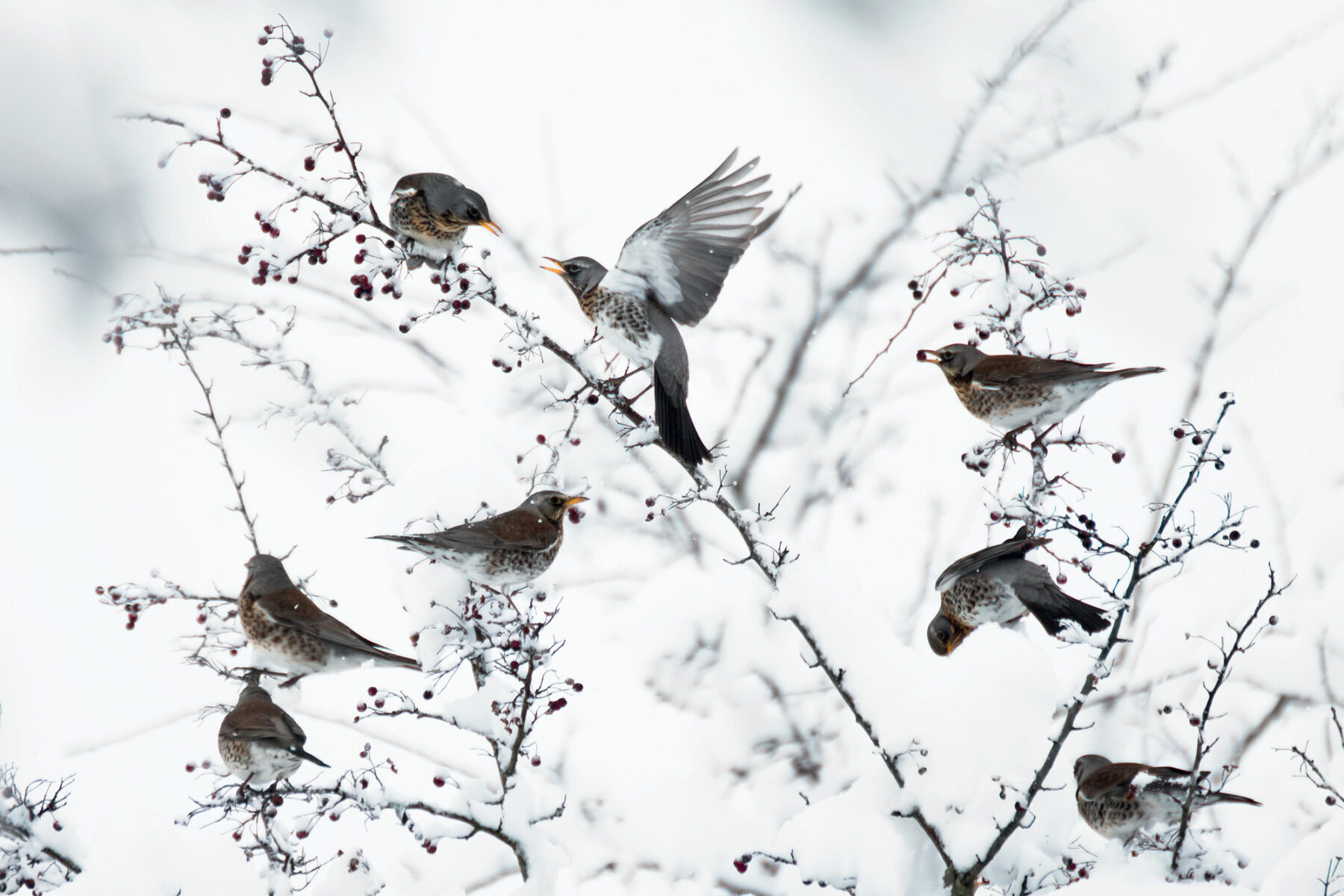 Vers 900 m d’altitude en ce début février, les nuits sont glaciales. Le thermomètre descend souvent sous les -10 °C. Depuis quelques jours, j’ai repéré un magnifique chat sauvage qui chasse régulièrement le long d’un bosquet. Je me place à l’affût avant le lever du soleil. Caché à plat ventre, je suis moins visible et cela m’offre une prise de vue rasante. Isolé du sol par un tapis de mousse, j’ai tout l’équipement nécessaire pour faire face aux températures négatives. Le jour pointe son nez mais le chat n’est pas dans la prairie. Dans le petit bois, à 80 m sur ma droite, des grives litornes se régalent de baies d’aubépine.