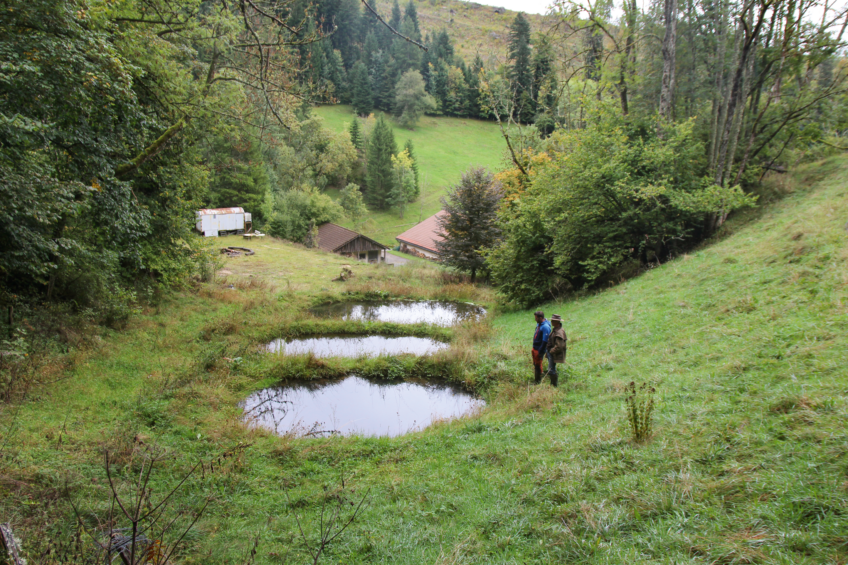 « C’est hyper important de restaurer des points d’eau, on en a perdu énormément avec le drainage, le captage de sources, l’urbanisation... En les multipliant, les amphibiens ou les libellules peuvent se redéployer. Ici, les trois mares sont très proches, donc cela crée une grande étendue aquatique avec beaucoup de microhabitats tout autour », confie le biologiste, aux lunettes rondes et à la veste imperméable bleue. Cette assertion est d’autant plus vraie dans le Jura où les sols karstiques ont toujours rendu les points d’eau assez rares.