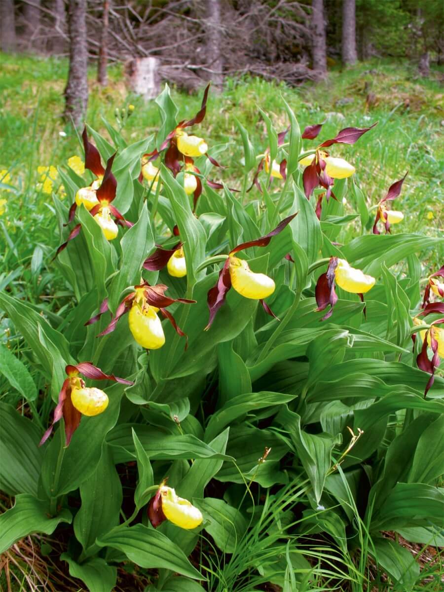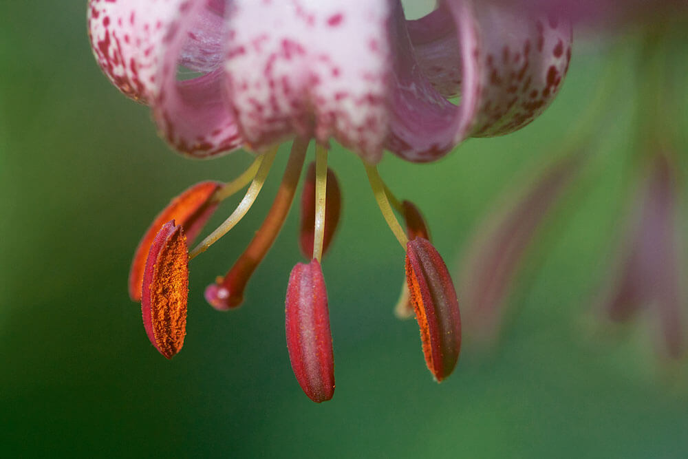 Clochettes pourpres aux battants orangés « Le long du chemin, fin juin-début juillet, la floraison du lis martagon est incontournable. La plante pousse très bien dans ces sols calcaires et atteint 90 cm. Ses fleurs pourpres en forme de cloche sont regroupées par petits groupes. Les anthères saillantes portent un pollen orange très vif. »