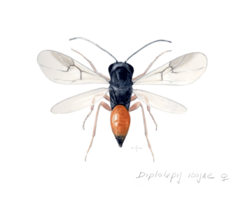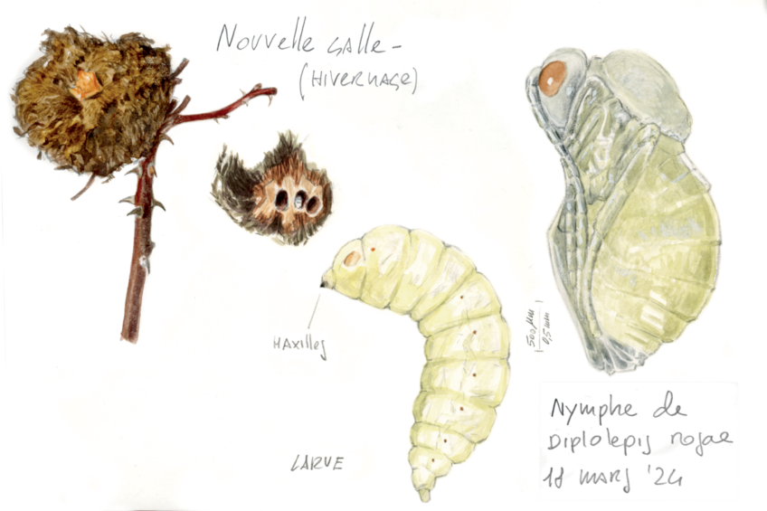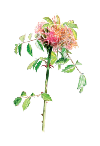 Ces structures, que l’on retrouve aussi au jardin sur des rosiers horticoles, ne sont pas de simples anomalies végétales. Ces pompons sont en fait la manifestation d’une galle, c’est-à-dire une réaction des plantes à l’invasion de certains insectes. En lisant les résumés des nombreuses publications que leur a dédiées le monde scientifique, on apprend que tout commence avec le cynips du rosier, une minuscule guêpe qui vient pondre ses œufs au printemps dans les tissus végétaux du rosier sauvage. Diplolepis rosae, pour les intimes, provoque une prolifération désordonnée des cellules de l’arbuste épineux.