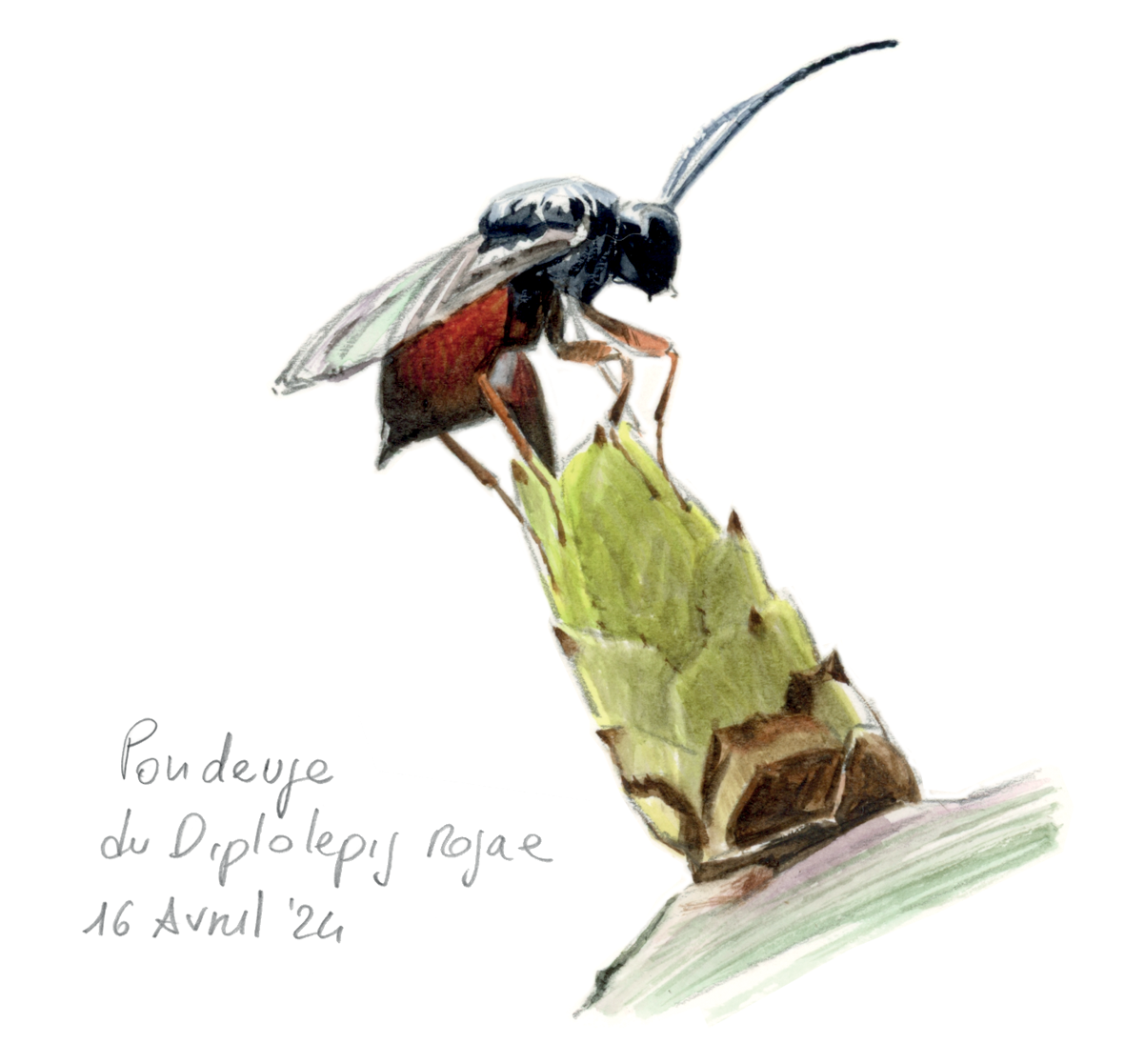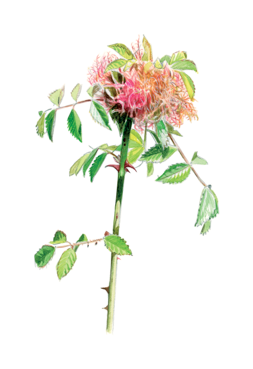Ces structures, que l’on retrouve aussi au jardin sur des rosiers horticoles, ne sont pas de simples anomalies végétales. Ces pompons sont en fait la manifestation d’une galle, c’est-à-dire une réaction des plantes à l’invasion de certains insectes. En lisant les résumés des nombreuses publications que leur a dédiées le monde scientifique, on apprend que tout commence avec le cynips du rosier, une minuscule guêpe qui vient pondre ses œufs au printemps dans les tissus végétaux du rosier sauvage. Diplolepis rosae, pour les intimes, provoque une prolifération désordonnée des cellules de l’arbuste épineux.